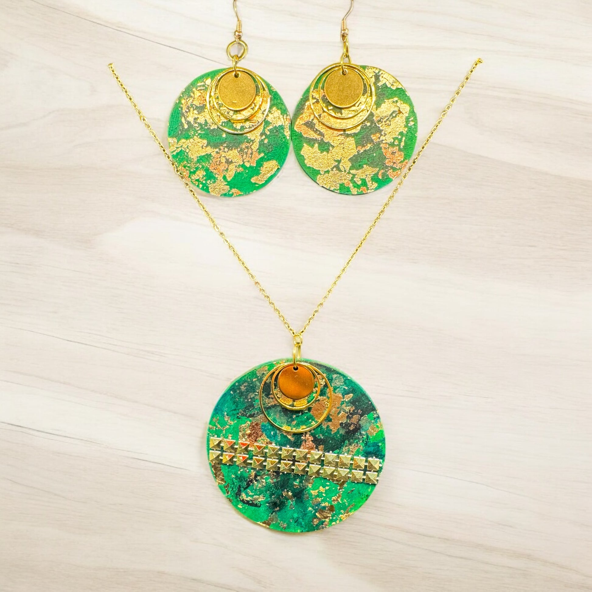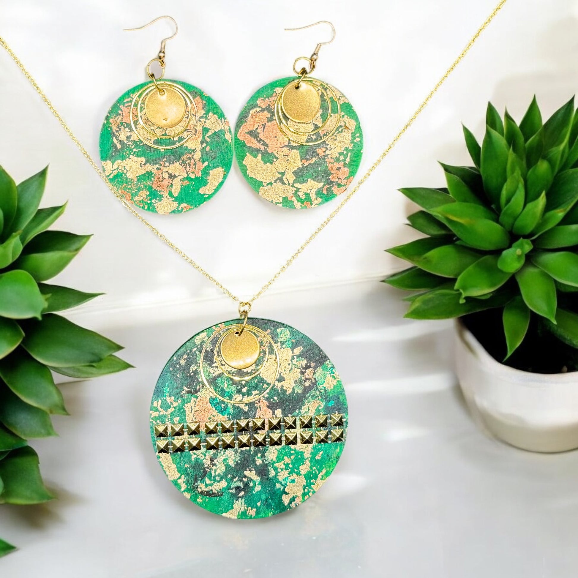 Make a bold statement with the Camo Luxe jewelry set, featuring hand-painted wood in a rich green and gold camouflage-inspired design. The set includes 2-inch wood circle earrings and a striking 3-inch pendant, both adorned with gold-plated chains and accents for a refined touch. The fusion of rugged camo tones with elegant metallic details creates a “camo-chique” aesthetic, perfect for those who love bold, stylish, and unique accessories.