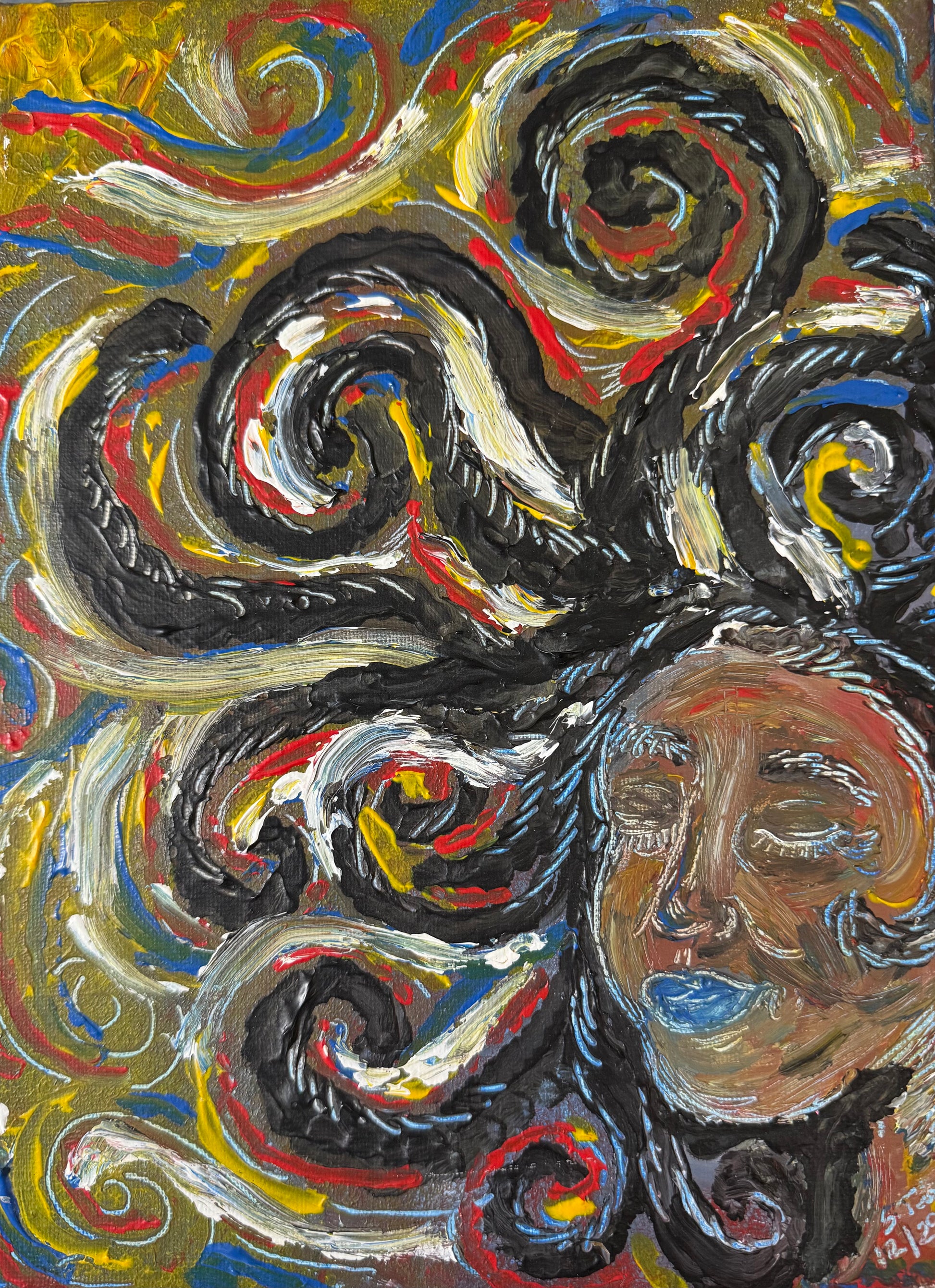 The crowned figure, eyes gently closed, is surrounded by an explosion of color, line, and layered texture—evoking natural curls, cosmic currents, and ancestral energy. Inspired by Afro-Indigenous identity and created at an early stage in the artist’s journey, this painting honors the spirit of resilience, transformation, and self-possession.