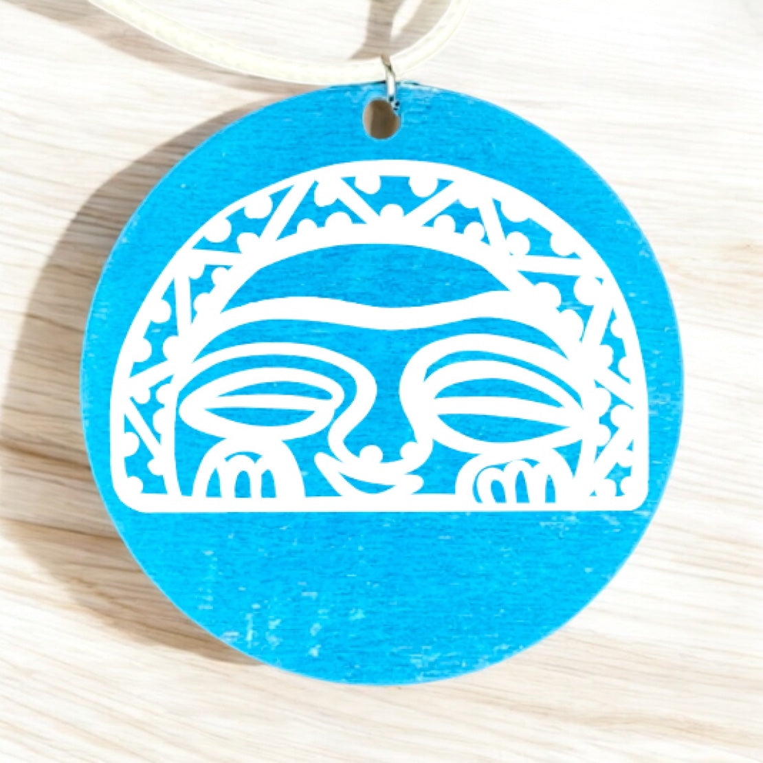 Hand-painted 2 inch wooden circular pendant featuring the Taino petroglyph for la “Diosa Luna" widely believed to be the Taino moon goddess. The Taino people believed that the moon and sun were central to life. They also believed Diosa Luna had the ability to grant fertility. The pendant is available in several colors and made to order. The pendant hangs from a 20 inch wax sealed necklace cord.