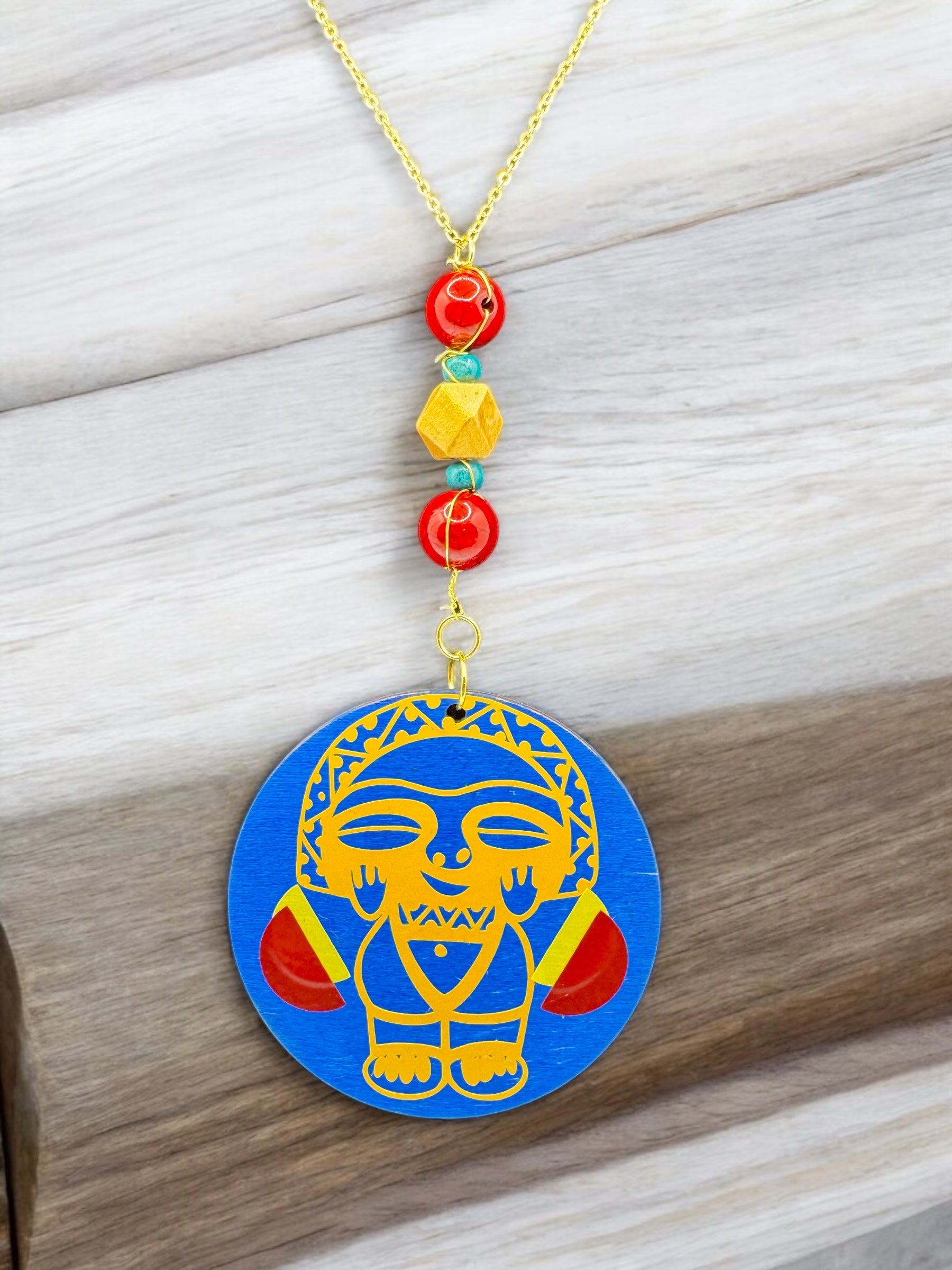 Celebrate divine feminine energy with the Diosa Luna Pendant from the Talindo line. This vibrant, unisex necklace features a 3-inch hand-painted wood pendant adorned with the powerful image of Diosa Luna, accented in bold vinyl and finished with radiant gold details. Beaded with rich red, turquoise, and yellow tones, this piece honors ancestral beauty, cosmic connection, and balance—designed for all who embrace their inner light.