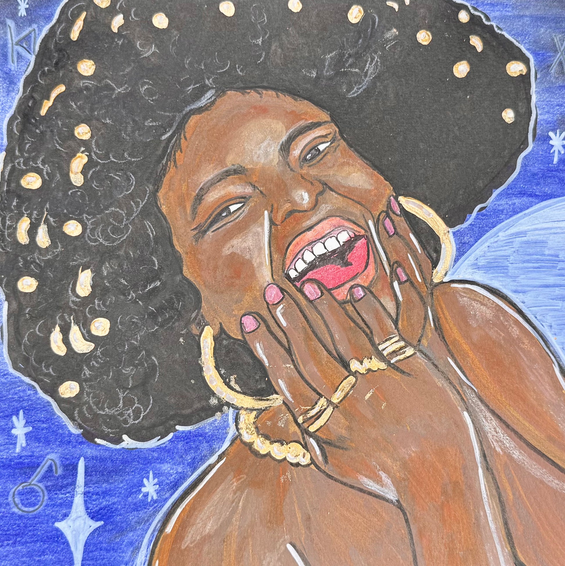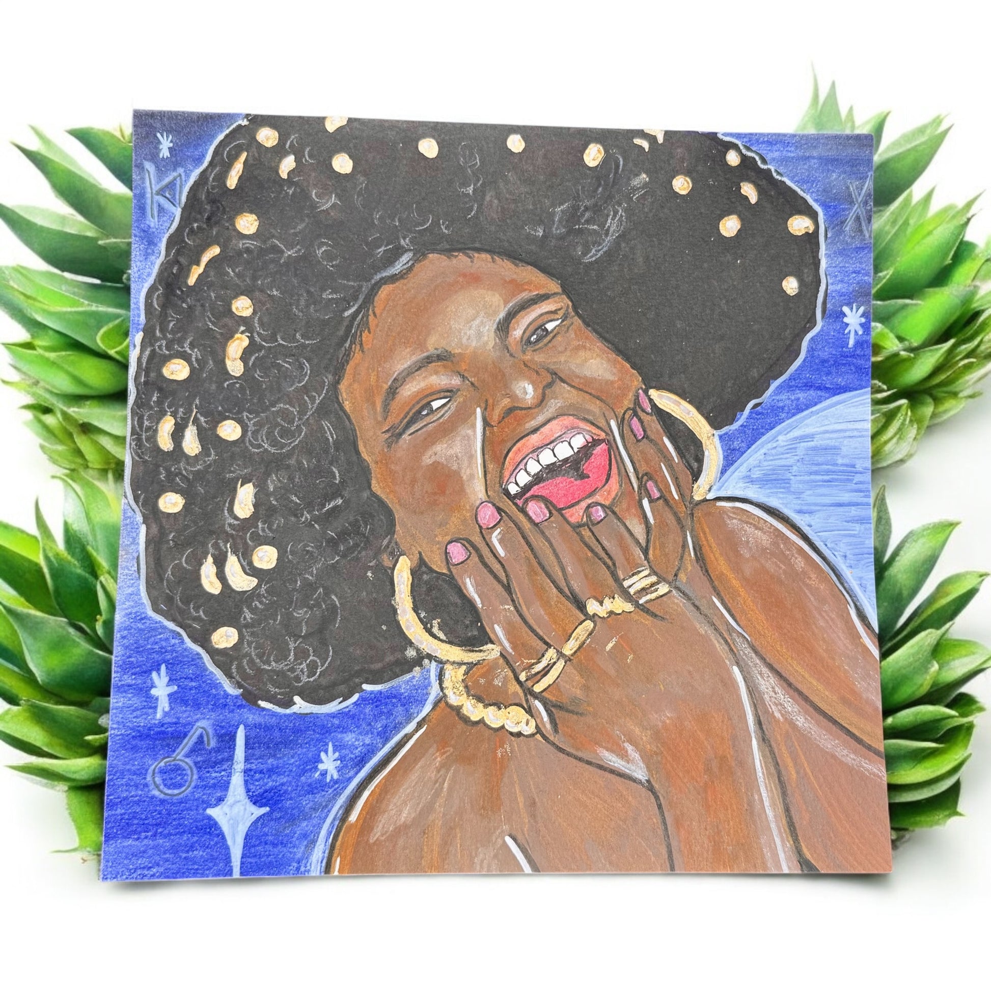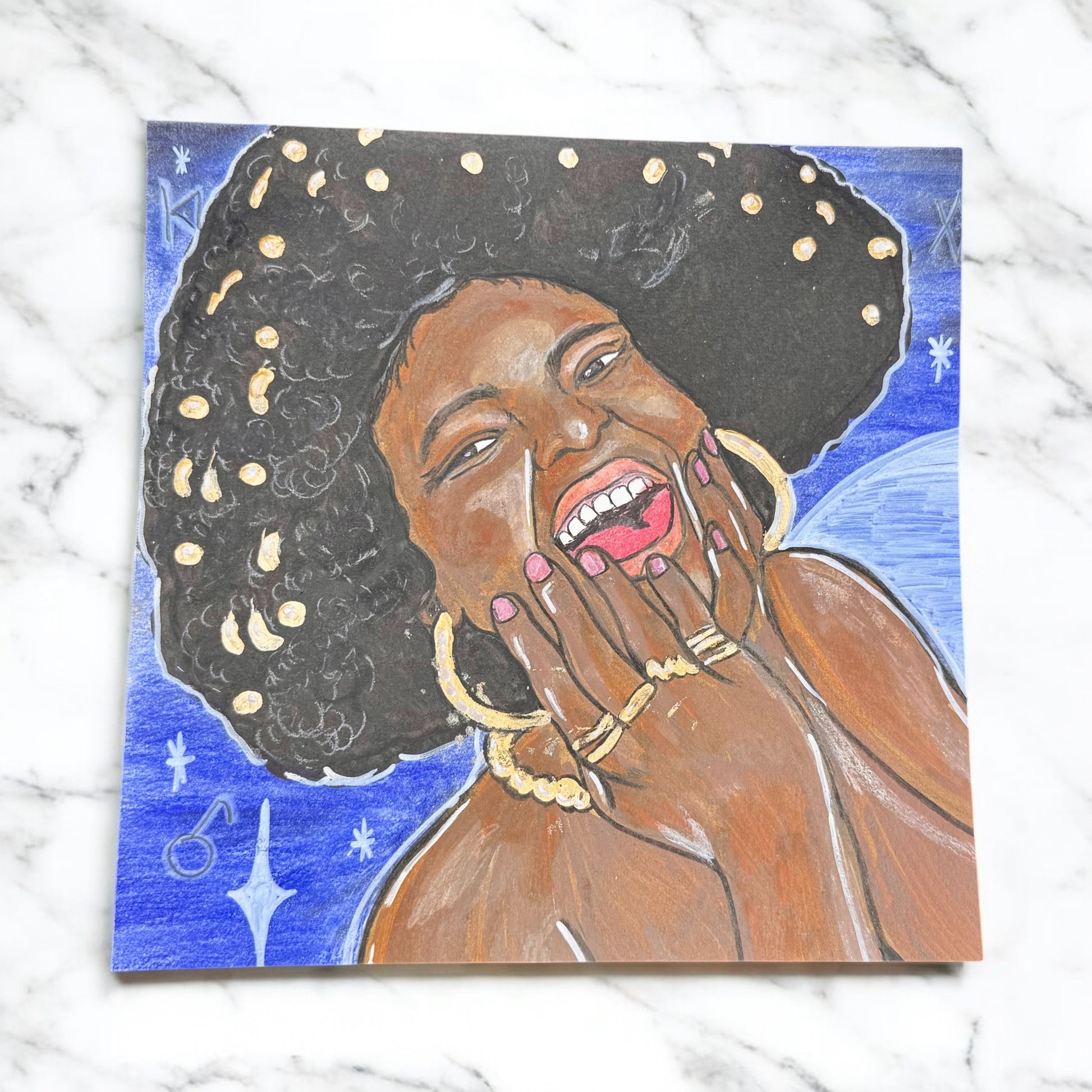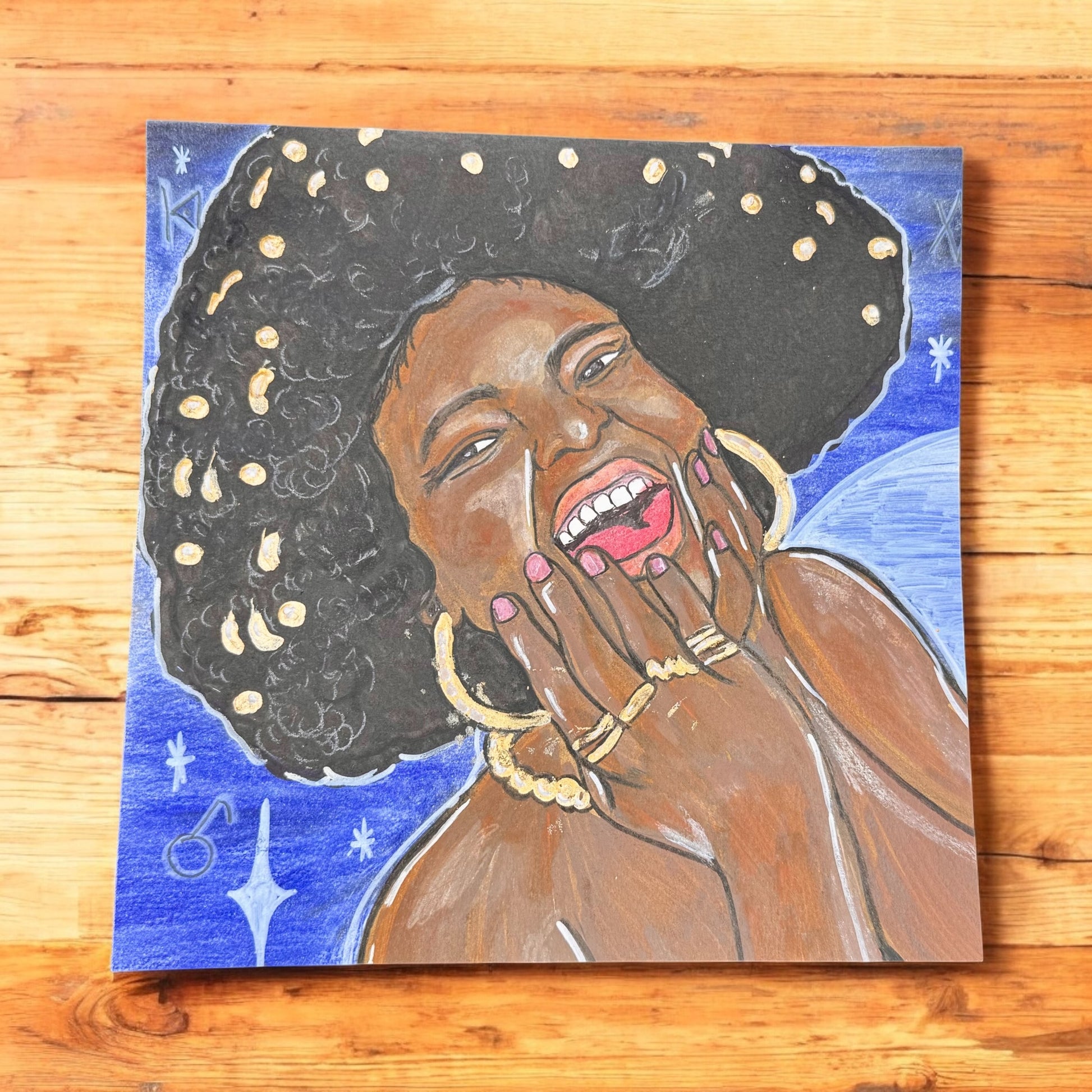 Diosa Luna (Study) is an 8x8 inch original mixed media piece created in October 2024 as part of an ongoing exploration of Taíno mythology. This joyful and celestial depiction of the moon goddess radiates divine femininity and ancestral power. The subject’s golden adornments and luminous afro echo the glow of the moon itself, set against a deep indigo sky filled with starlight and cosmic symbols.