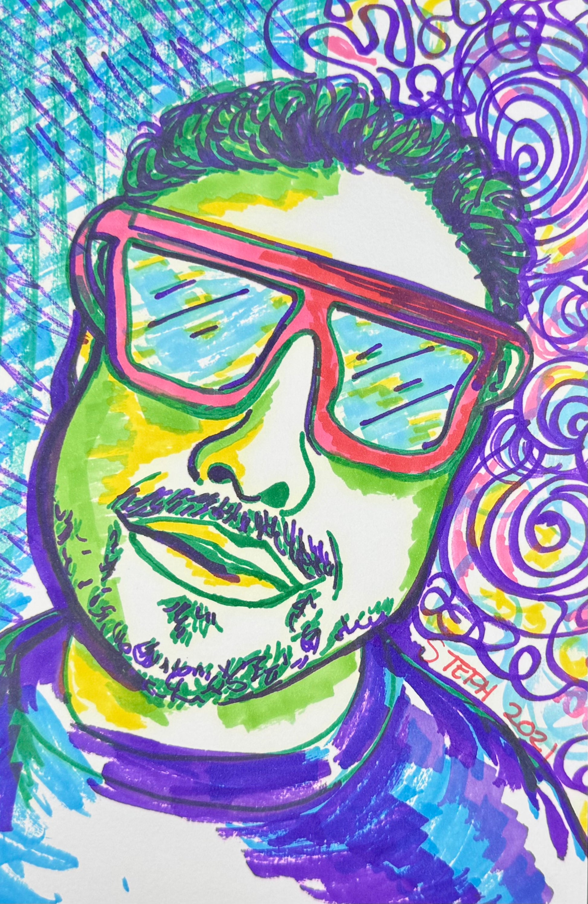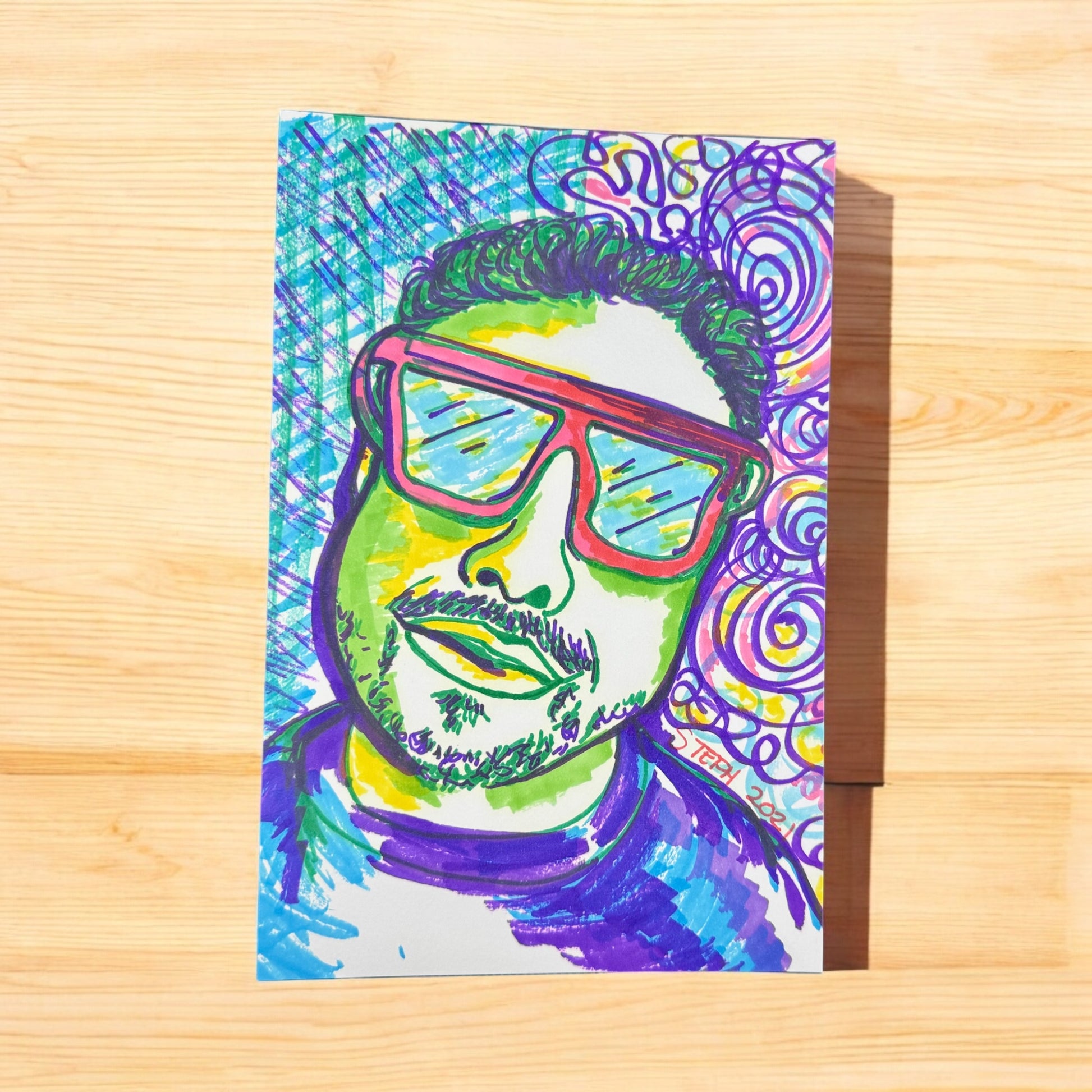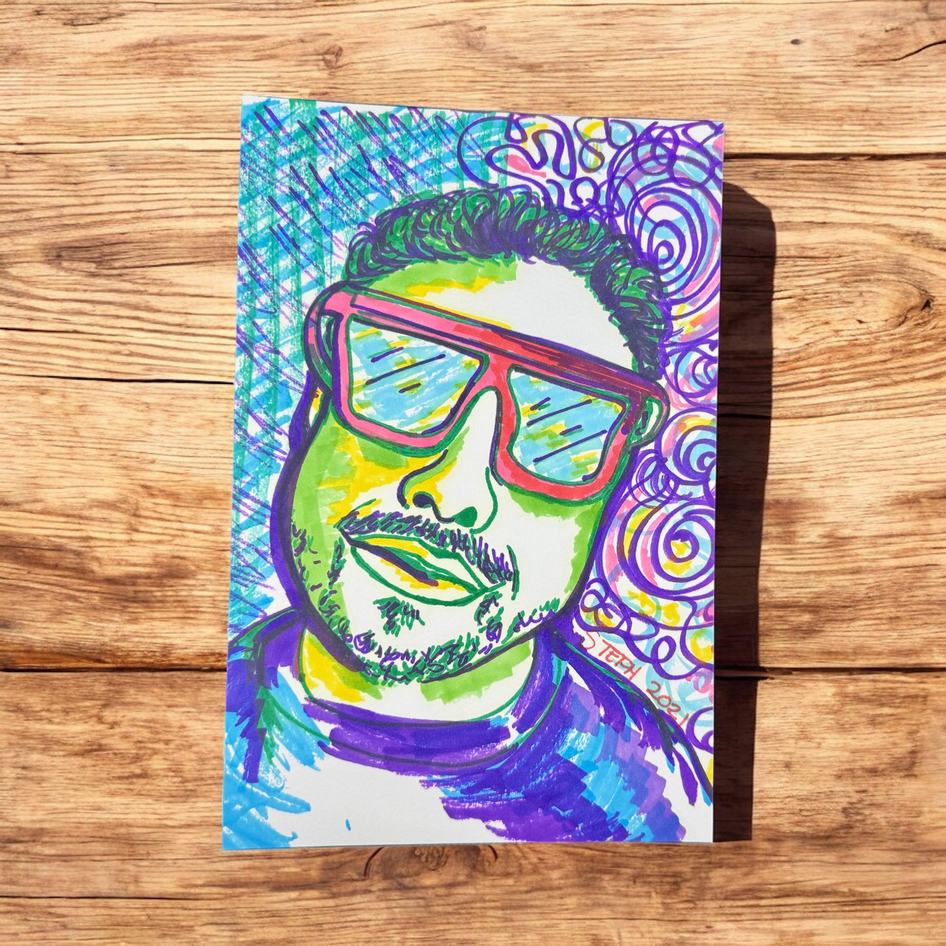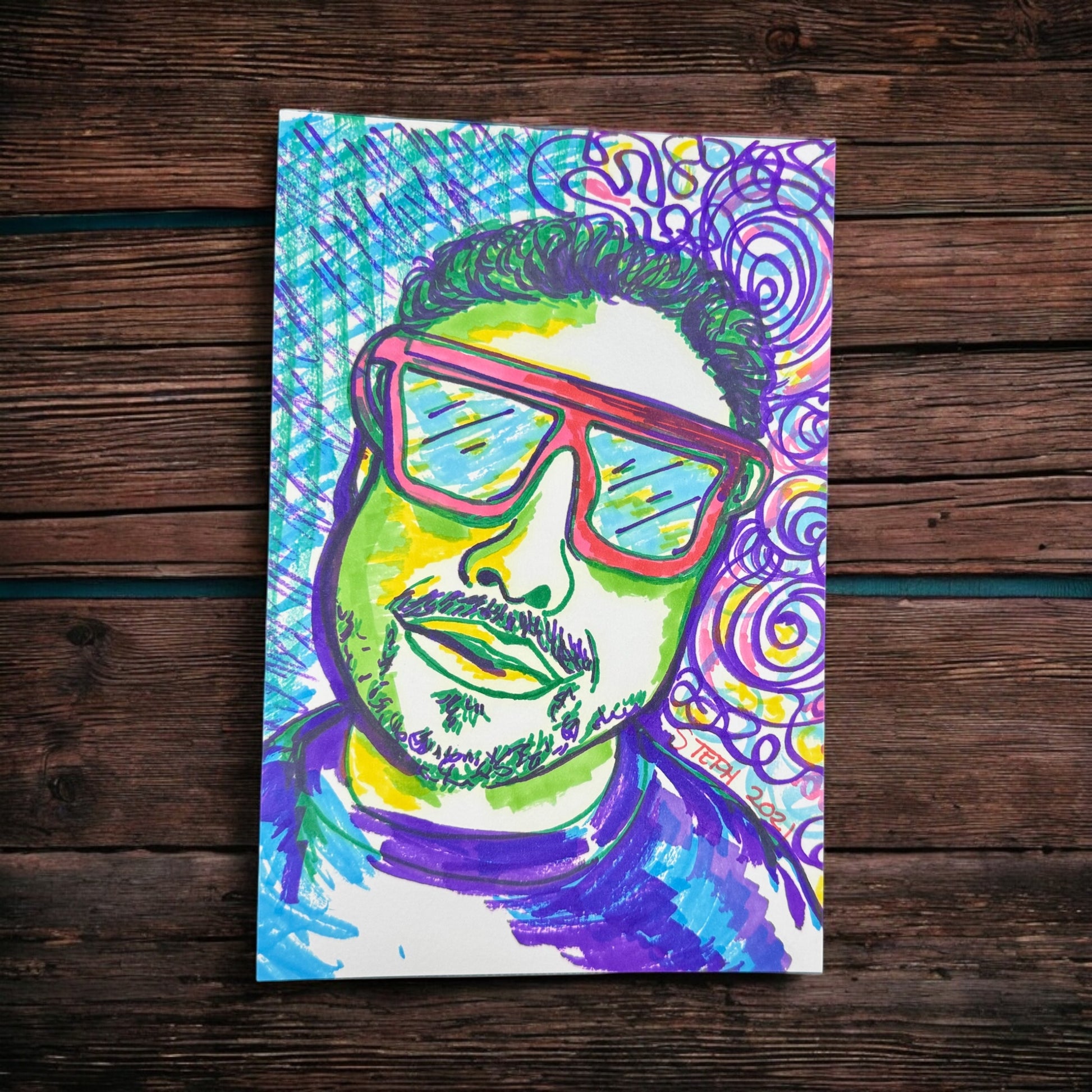 Neon Cool is a 9x6 inch original ink drawing that vibrates with color and confidence. Created in June 2021, this portrait captures a moment of cool, playful swagger, with neon hues, bold lines, and expressive textures.