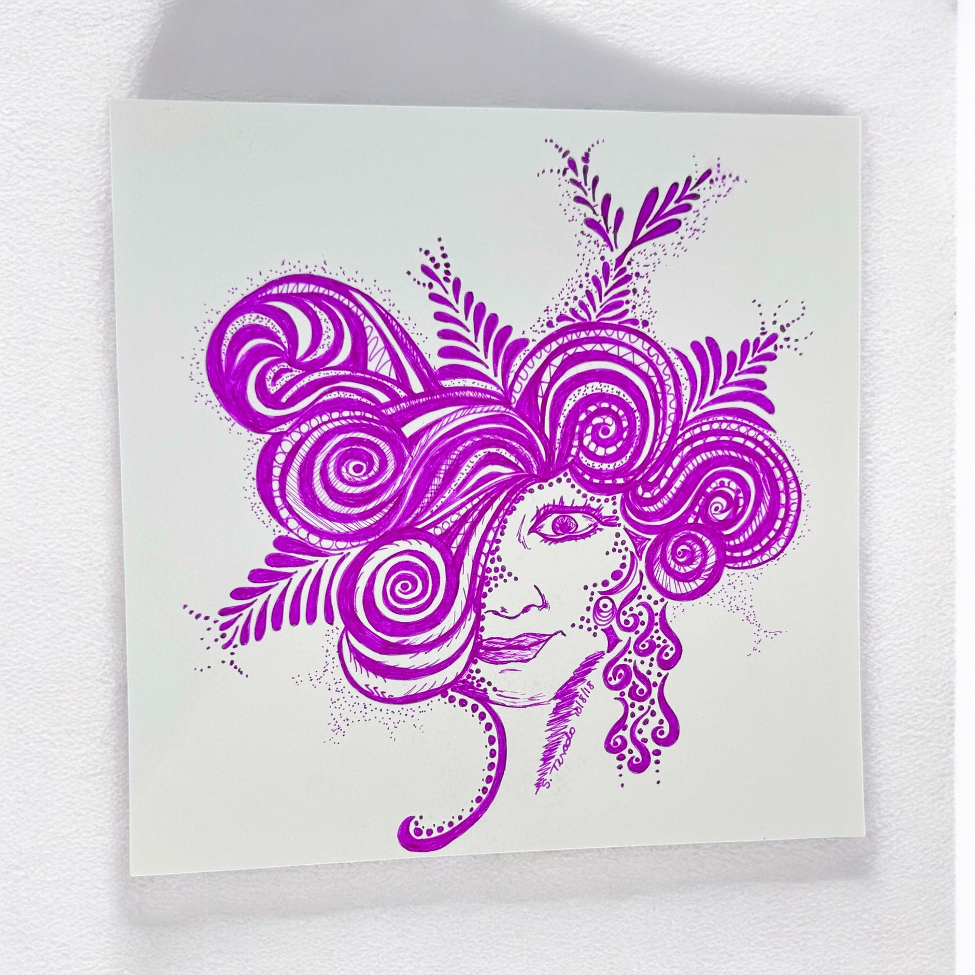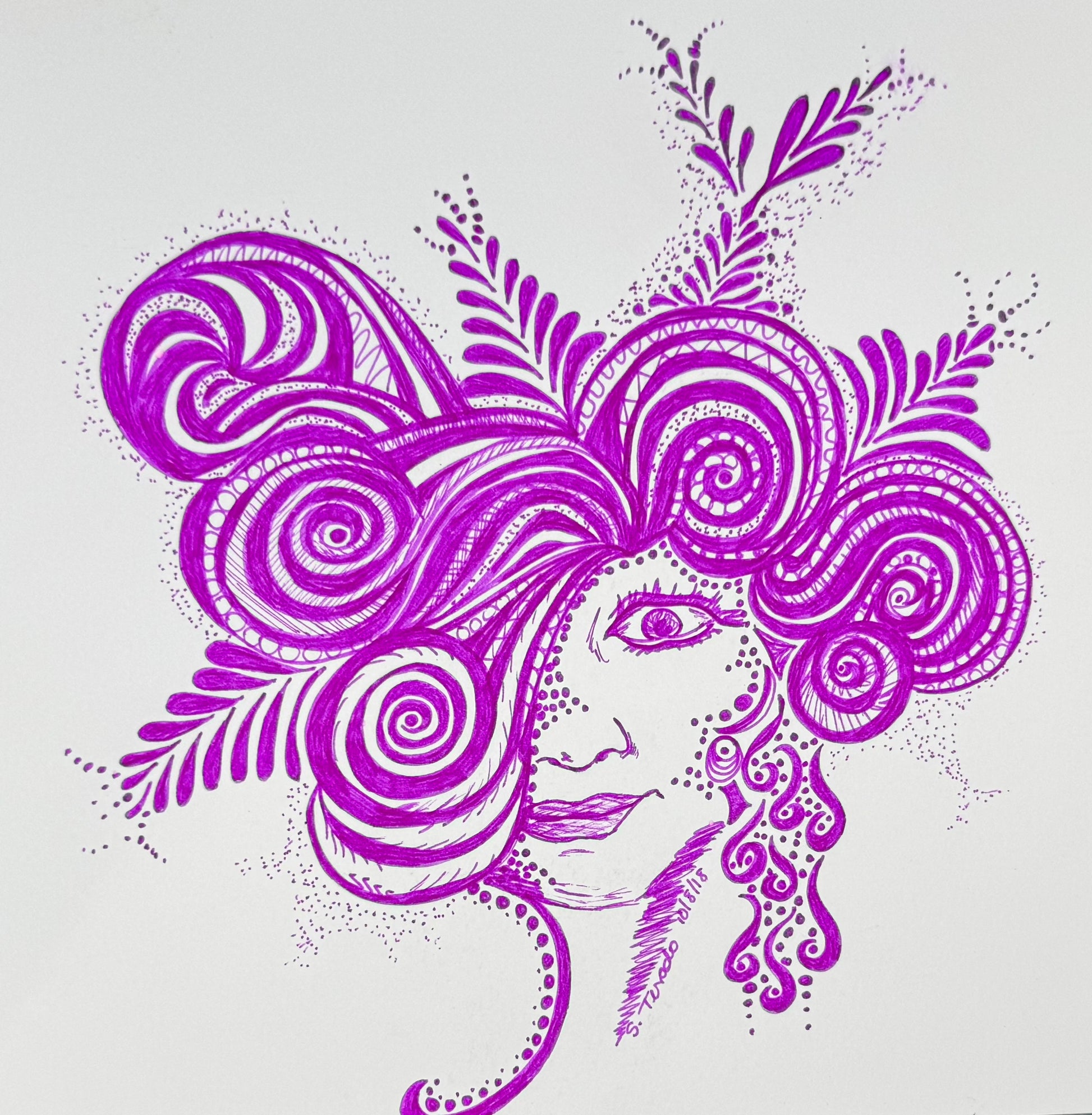 Flor de Espiral is an 8x8 inch original ink drawing created in October 2018. Rendered entirely in vivid violet, this piece captures a stylized feminine face blooming into a flourish of spirals, leaves, and delicate patterns. The design radiates organic energy and a whimsical strength, like a flower in full bloom—rooted, wild, and beautiful.
