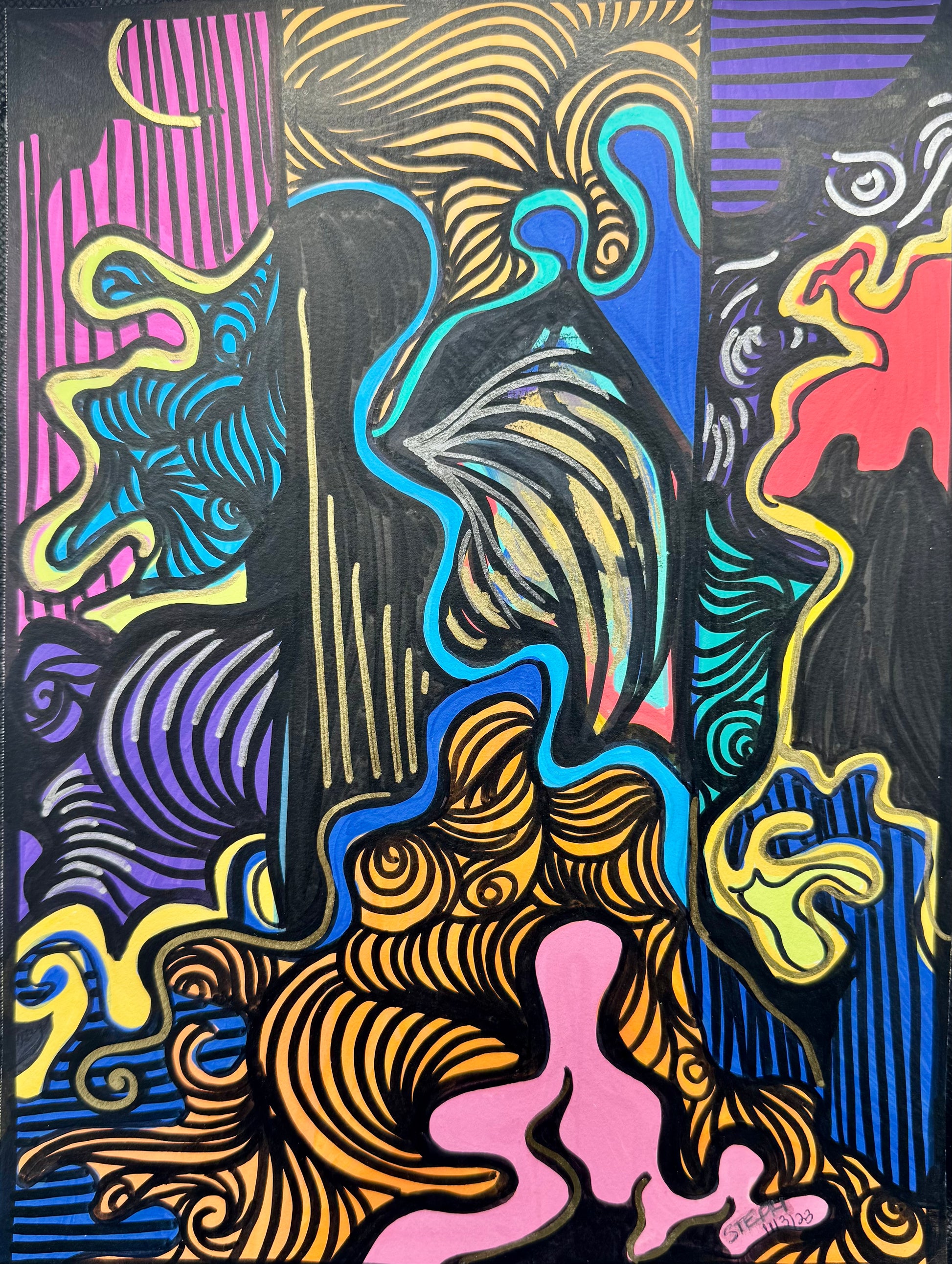Flow State is a 9x12 inch original abstract work created in ink, pulsing with color, rhythm, and movement. Bold lines, dynamic forms, and psychedelic waves swirl across the page in a vibrant interplay of chaos and control.