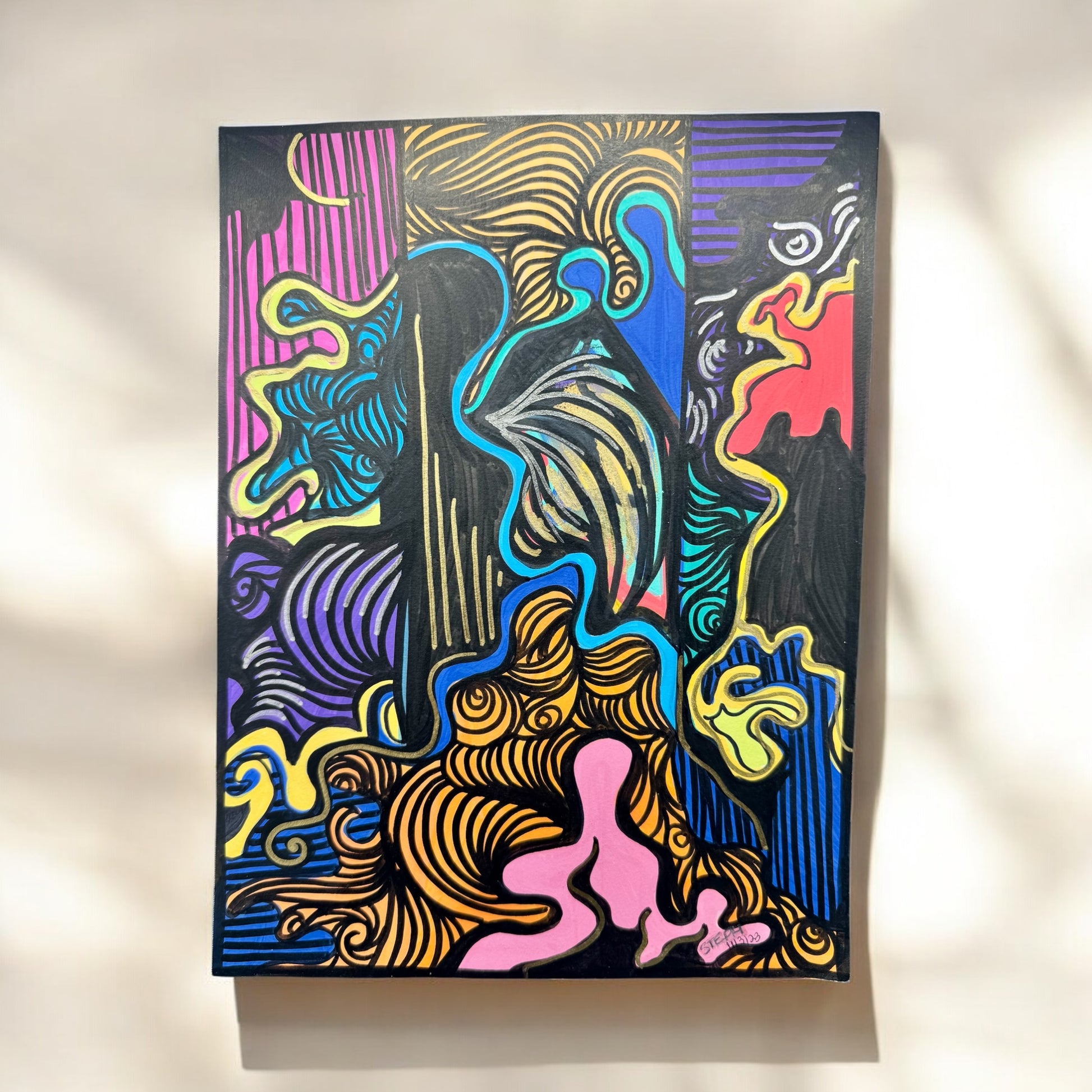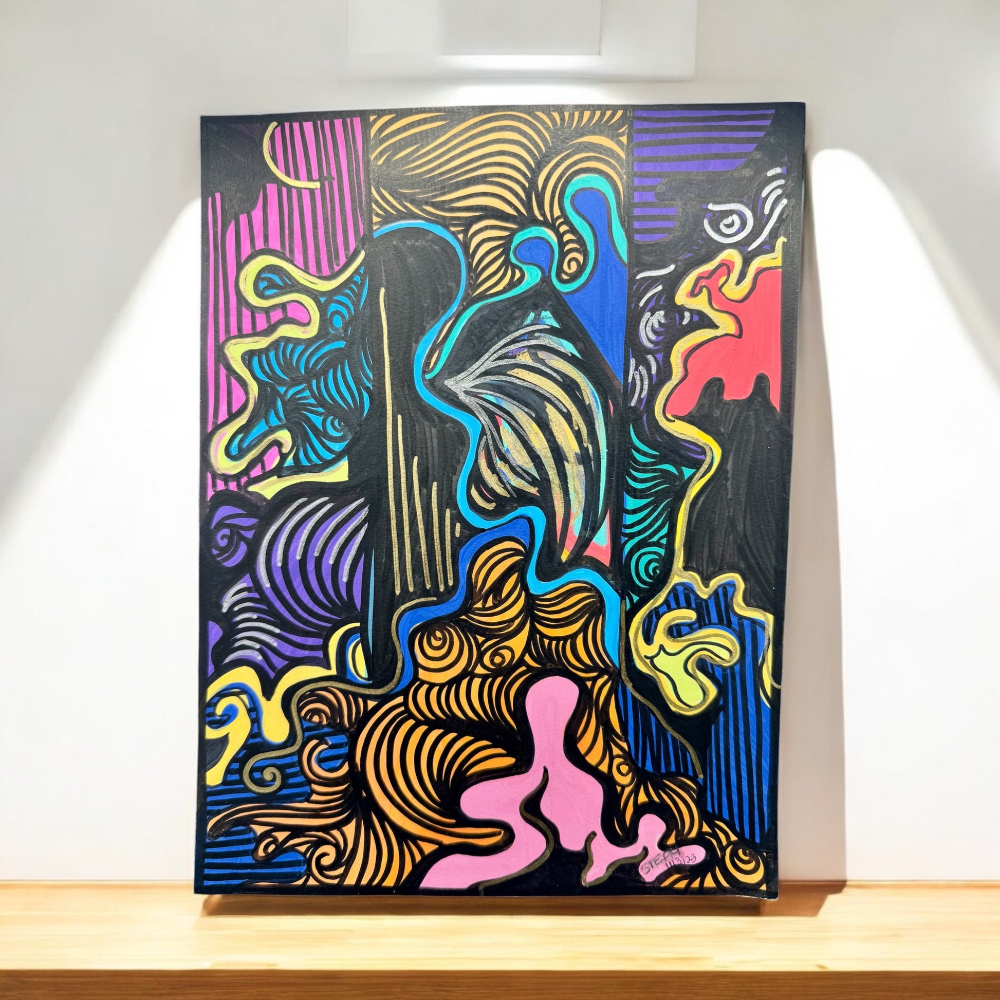 With no defined figures yet undeniable motion, the piece evokes the sensation of letting go and being swept into the current of creation. Pink and orange silhouettes emerge from golden spirals; blue, purple, and red currents twist through space like energy mid-transformation. It’s a meditation in motion—a visual representation of surrendering to the moment and allowing intuition to lead.