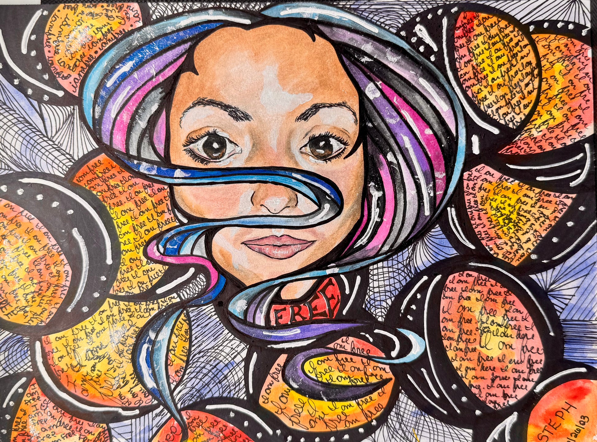 The central figure gazes forward with open, unflinching eyes—her expression calm, assured, and whole. Vibrant strands of color flow through her hair like waves of energy, encircling her and weaving through repeated affirmations of liberation: I am free. Orbs of yellow, orange, and red pulse around her like suns, each filled with handwritten declarations of strength and survival.