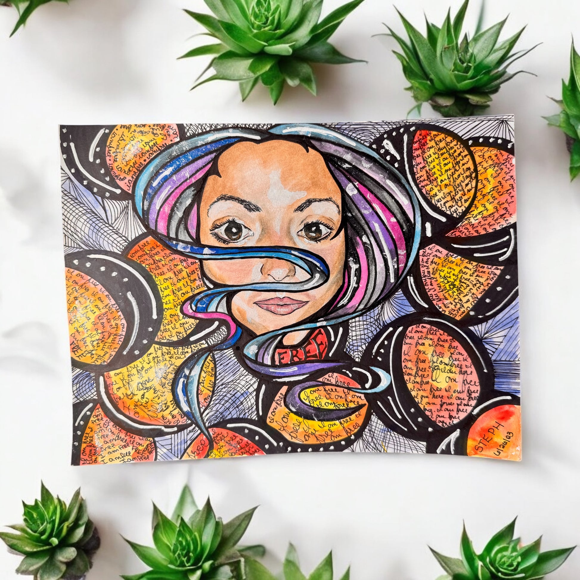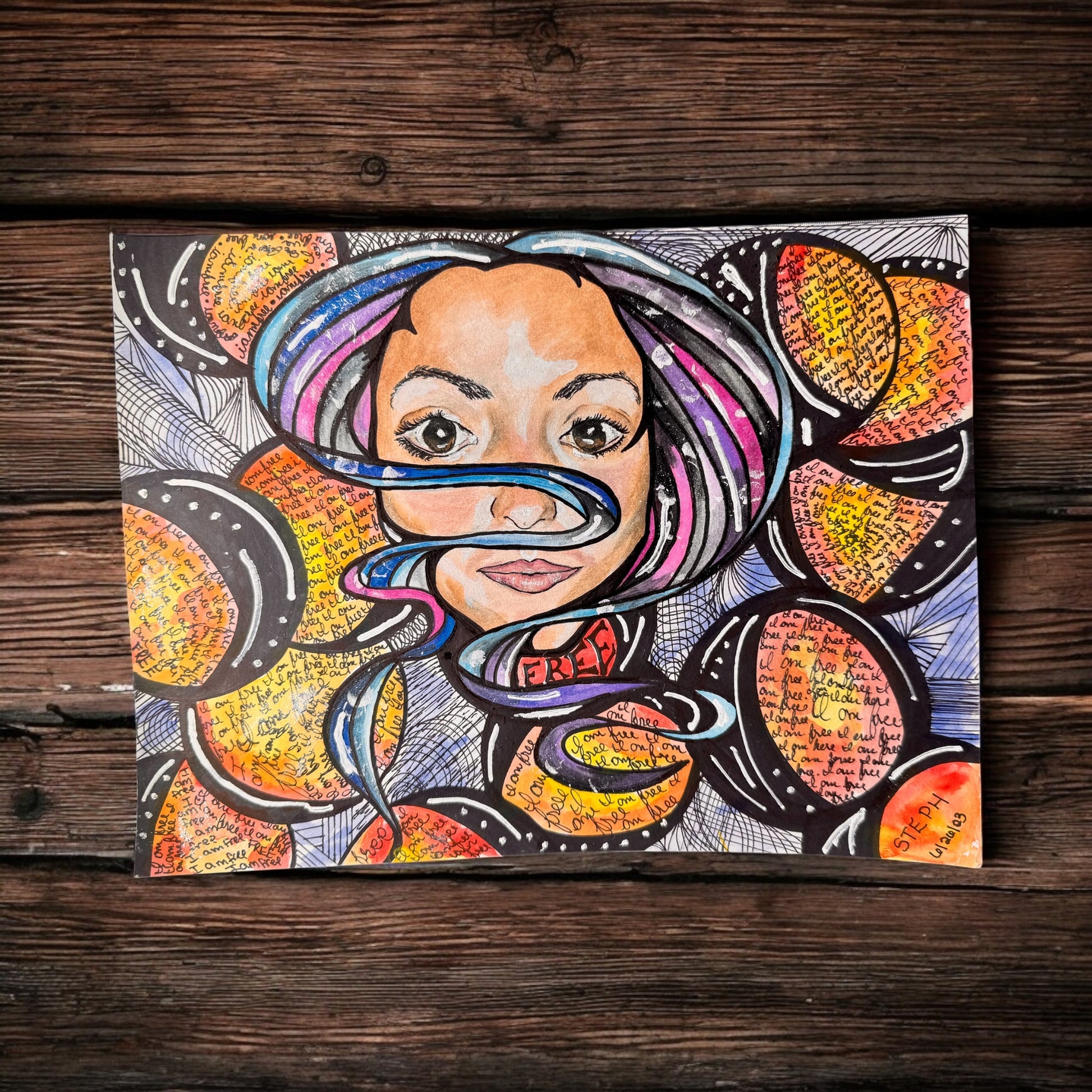 Free is a 9x12 inch original self-portrait created in colored pencil and ink, radiating with the energy of transformation, reclamation, and healing.