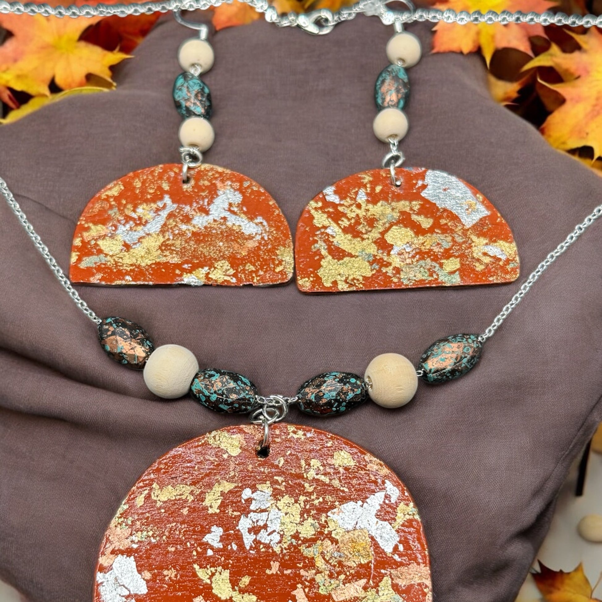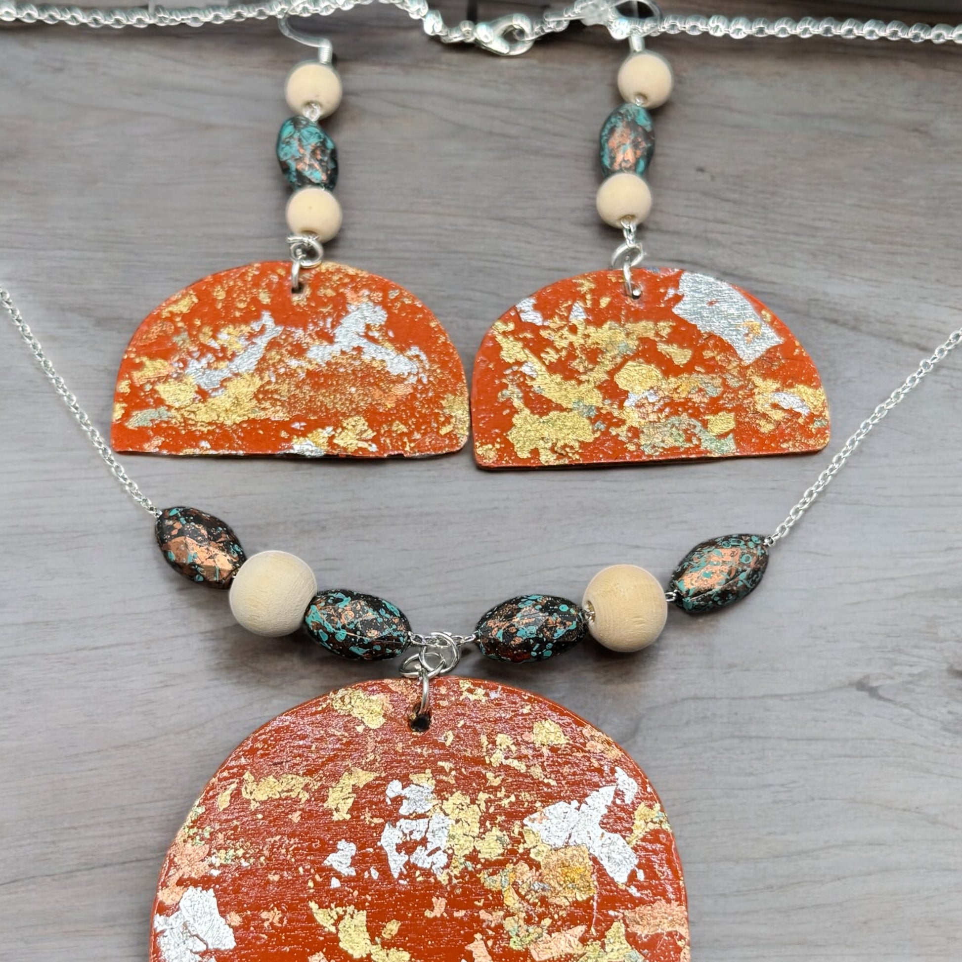 This stunning handcrafted jewelry set from OriginalsbySteph’s ‘Gilded Radiance” line features a bold and earthy design. The half-circle wooden pendant and matching earrings are hand-painted in a rich, warm hue and gilded with imitation gold and silver leaf, creating a striking textured effect. Accented with a mix of natural wooden beads and intricately patterned metallic-toned beads, this set beautifully blends organic elements with elegant shimmer, making it a bold statement piece.