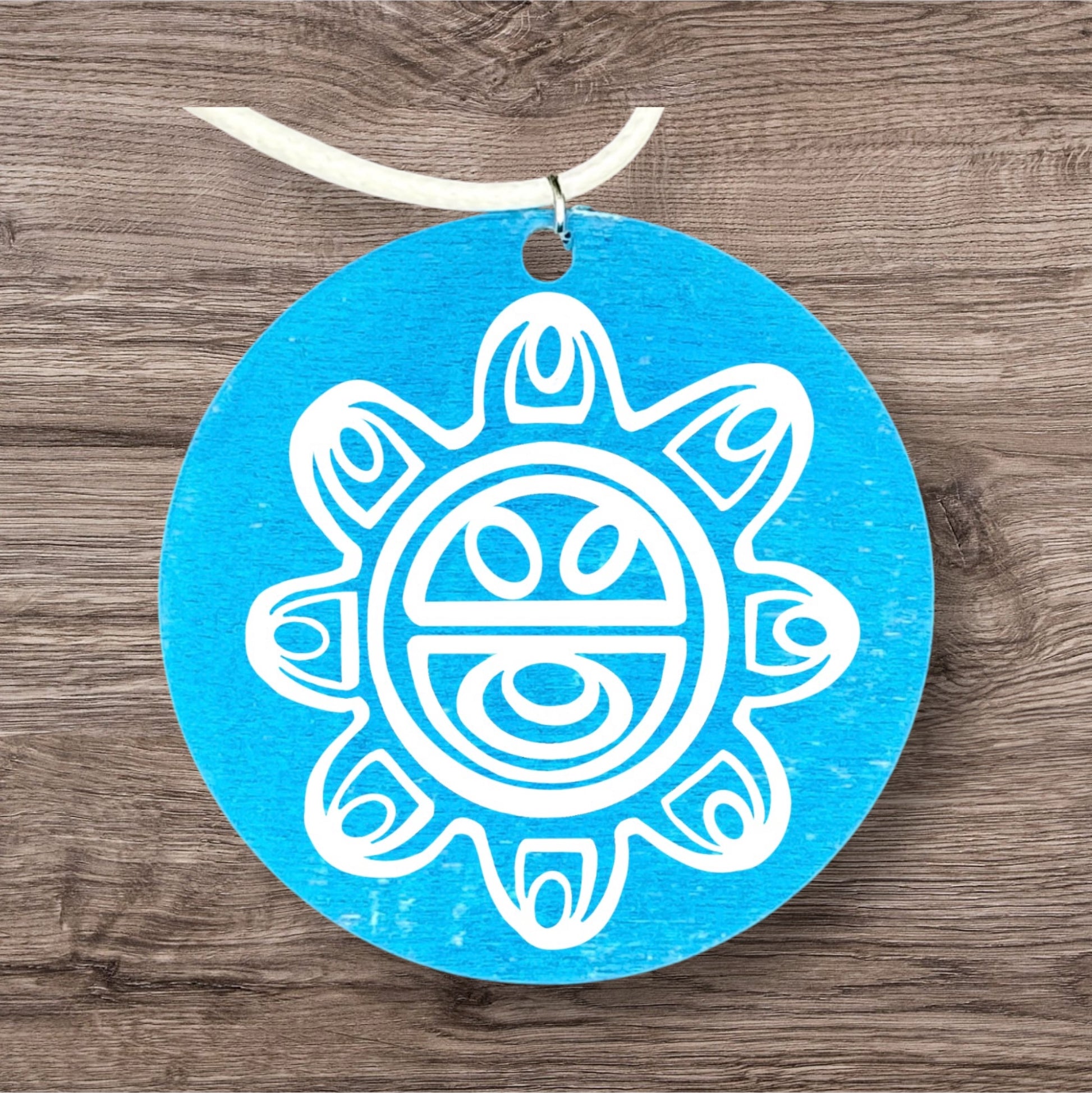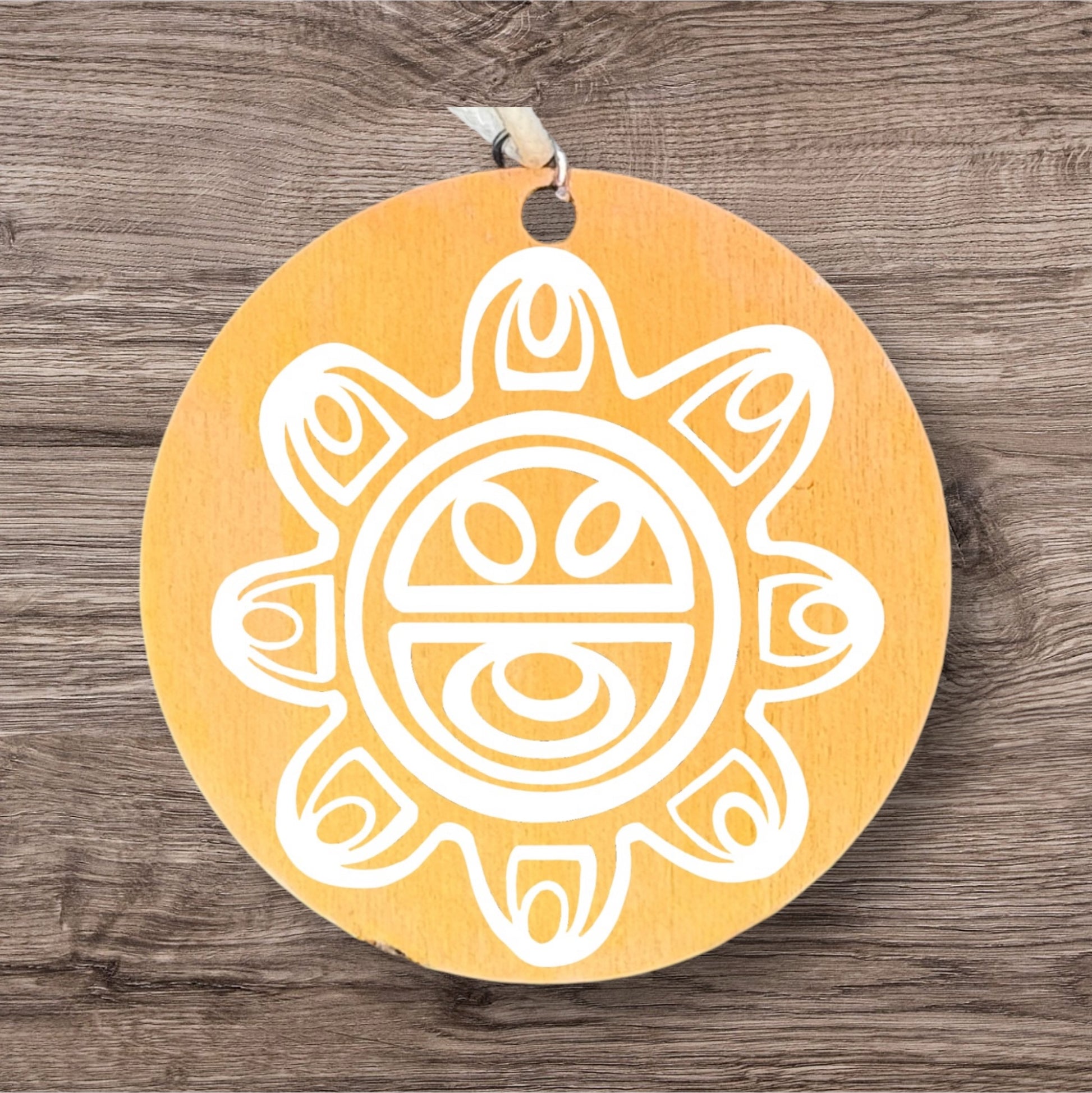 Hand-painted 2 inch wooden circular pendant featuring the Taino petroglyph for the Sun zemi “Guey.” The Taino people believed that the sun and moon central to life. The pendant is available in several colors and made to order. The pendant hangs from a 20 inch wax sealed necklace cord.
