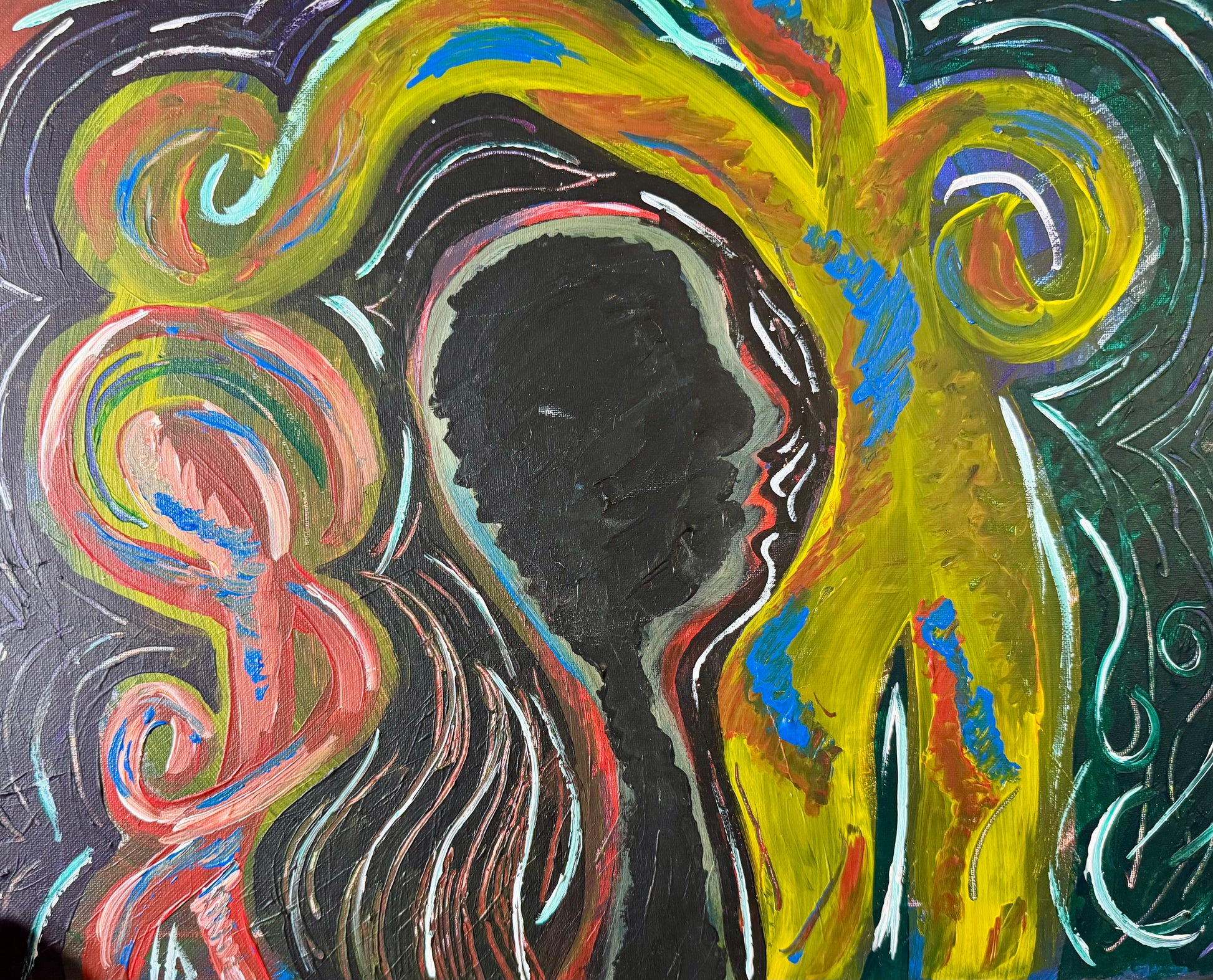 At its center is a shadowed silhouette—rooted yet in flux—surrounded by abstract feminine forms and symbols that suggest womb, movement, and divine presence. The energetic lines and gestural marks reflect a time of personal awakening and introspection, as the artist used paint to process and express inherited memory, resistance, and healing.