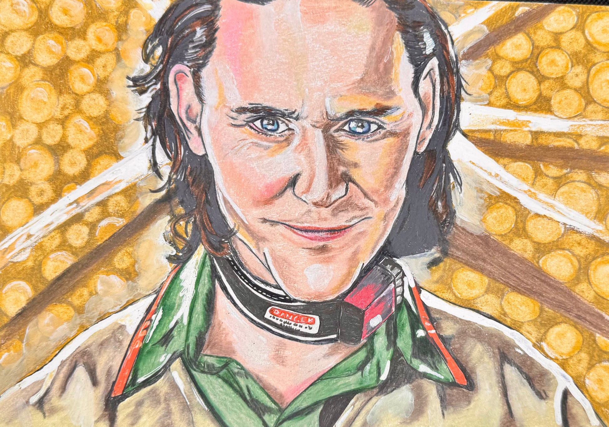 The golden time loop background and TVA collar nod to the show’s visual world, while the confident smirk and icy blue gaze channel Loki’s cunning, complexity, and charisma.