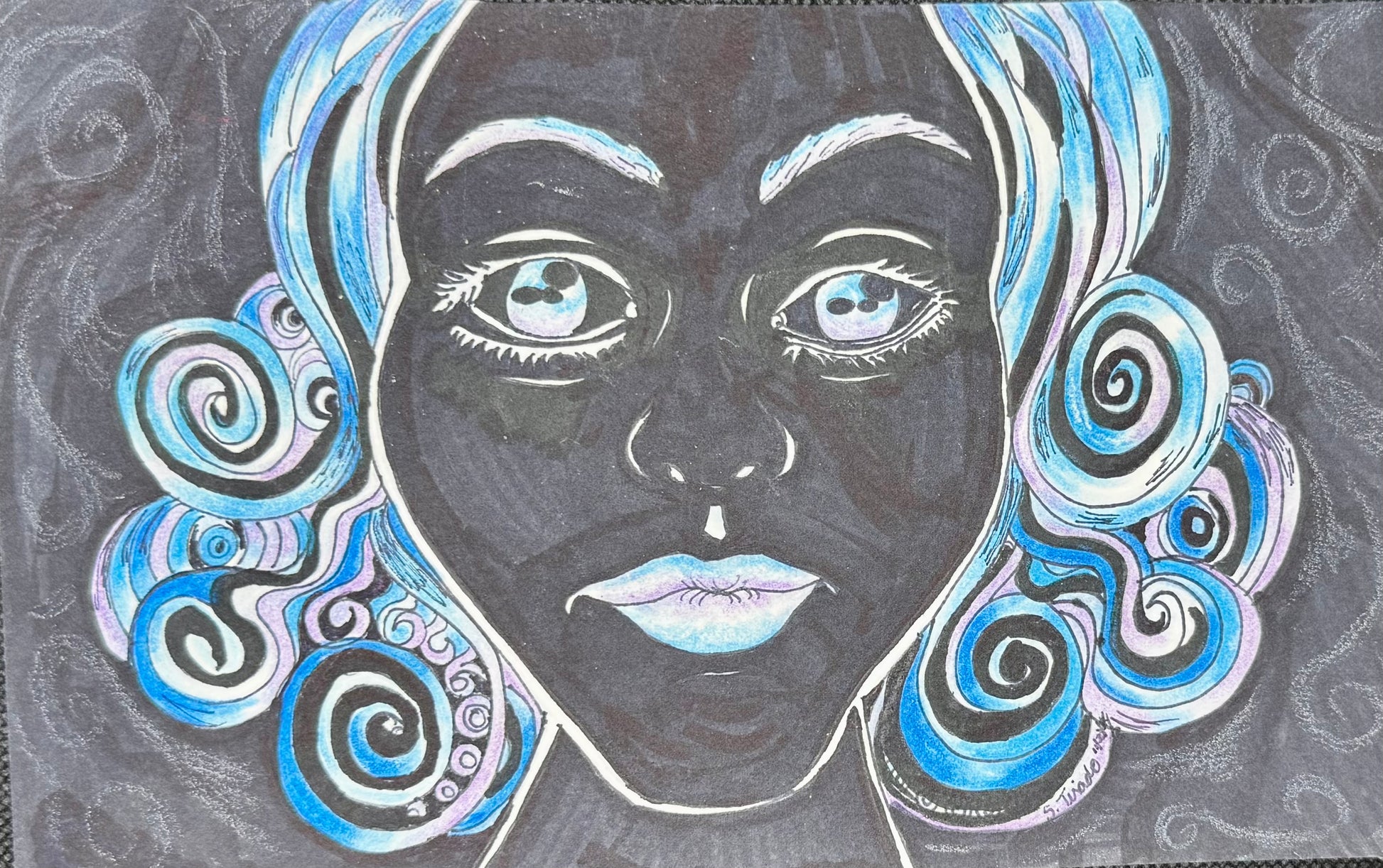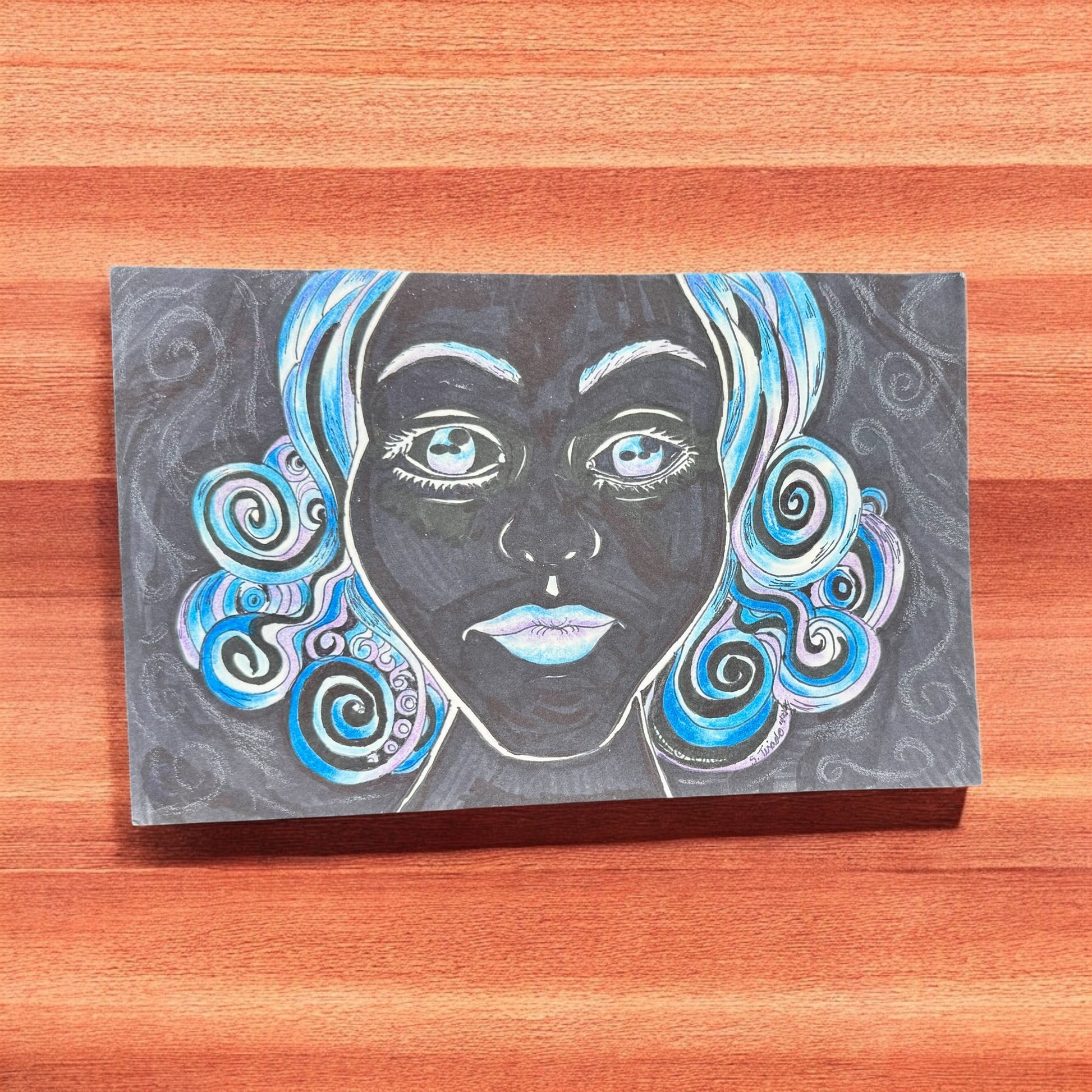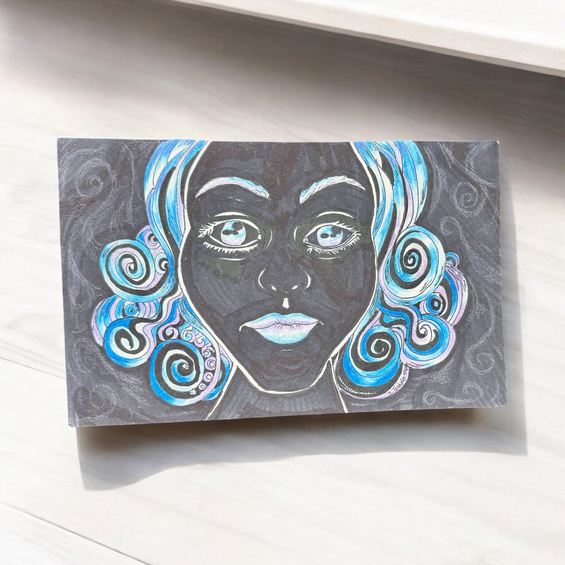 Midnight Spiral is a 5.5x8.5 inch original drawing created with colored pencil and ink. This portrait emerges from a black paper background like a vision in the dark—her luminous features framed by icy spirals of blue, violet, and white that echo the celestial.