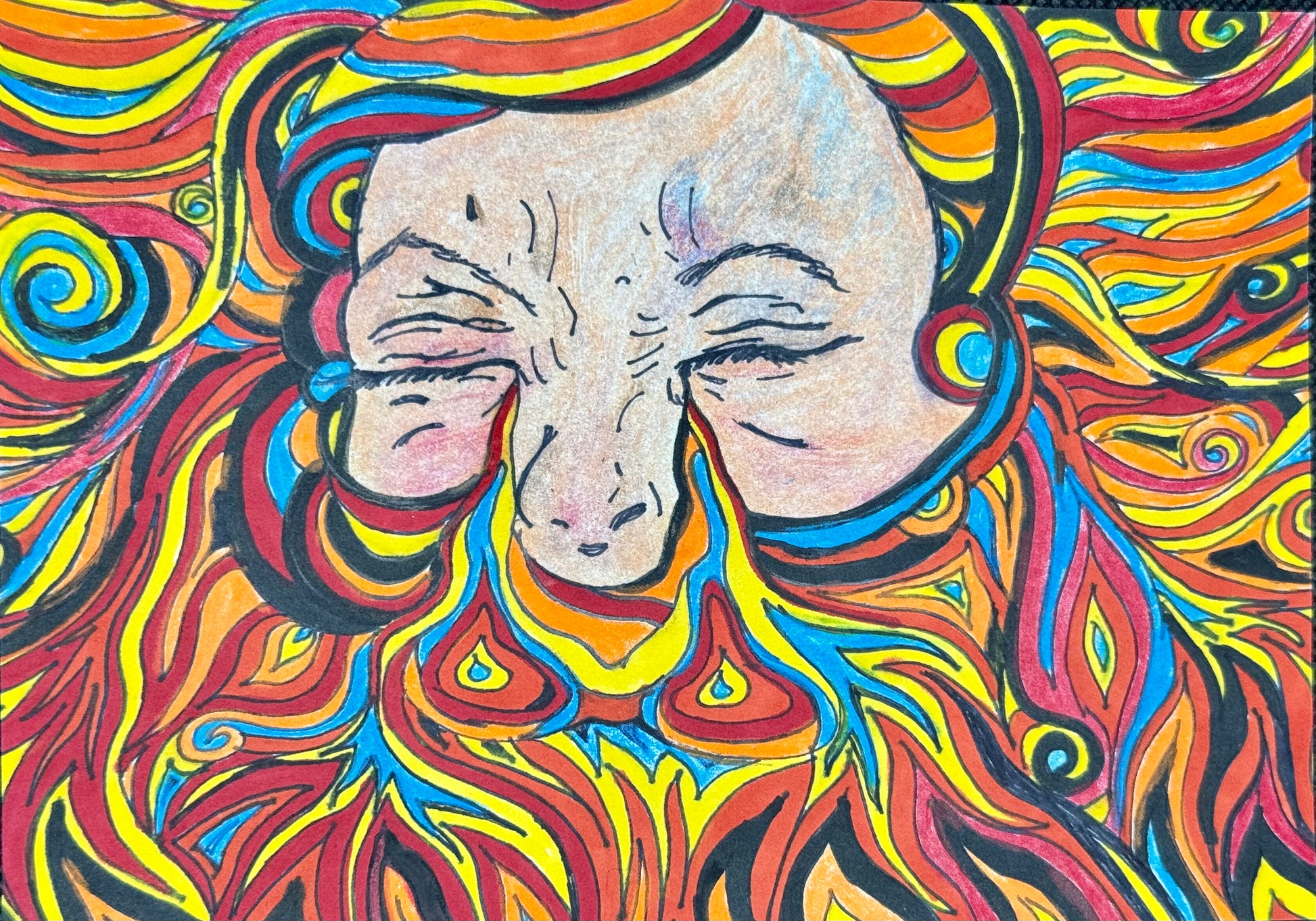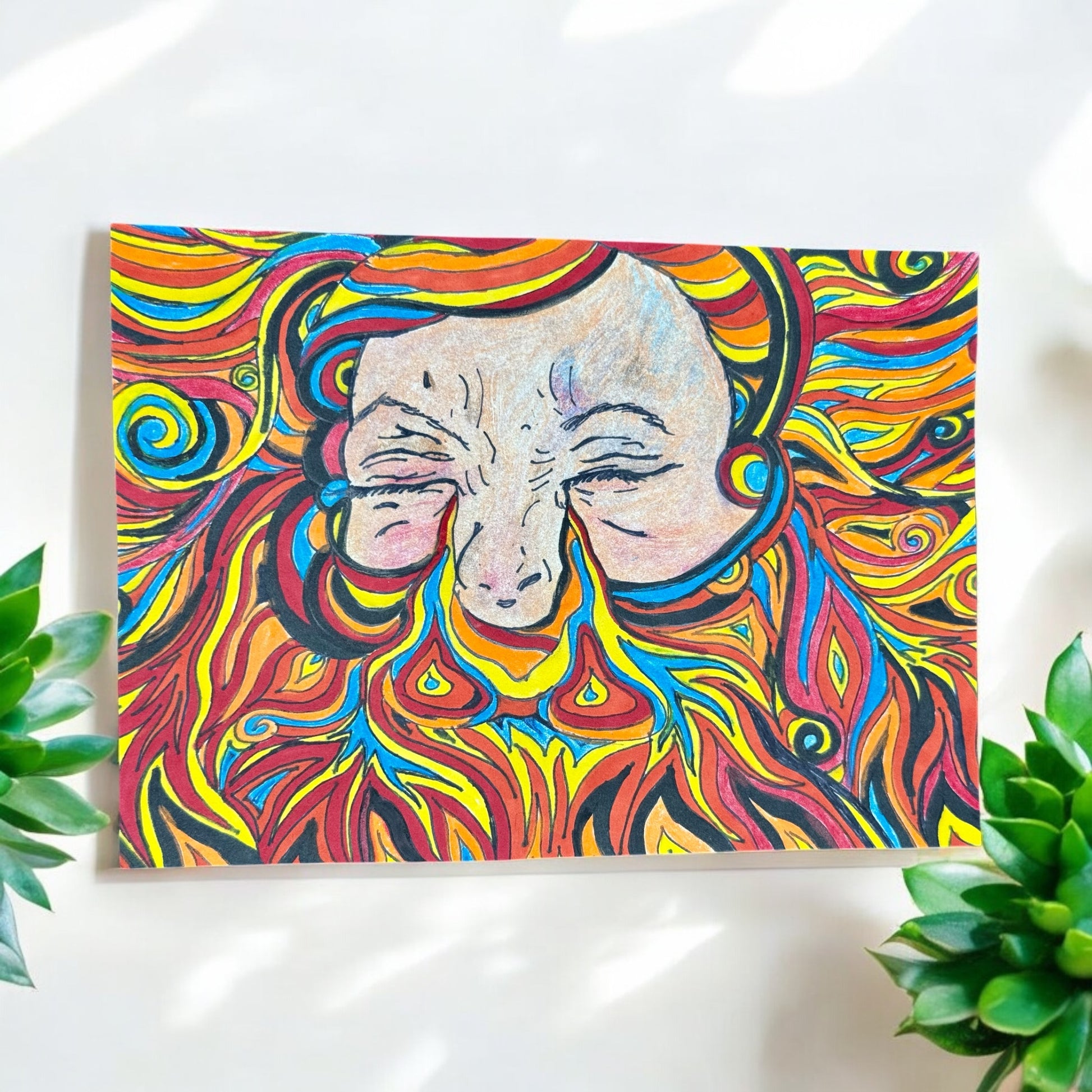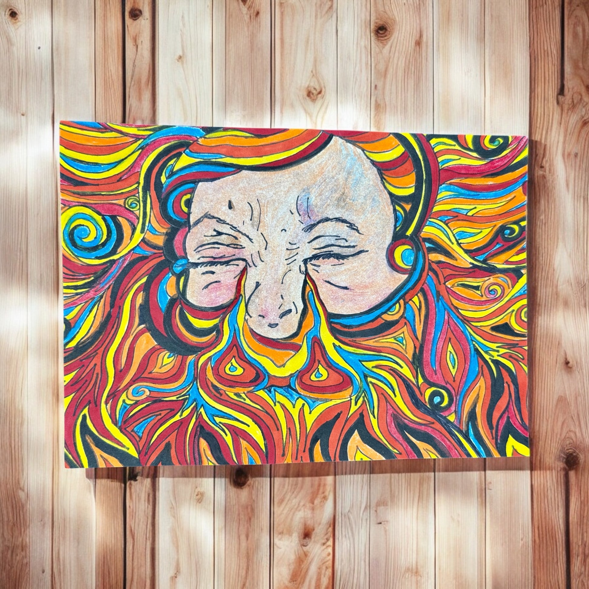 Teardrops of Fire is a 5x7 inch original drawing that channels raw emotion through explosive color. Created with colored pencil and ink, this early work captures a figure overwhelmed by feeling—eyes clenched, tears transforming into fiery, vibrant patterns that radiate across the page.