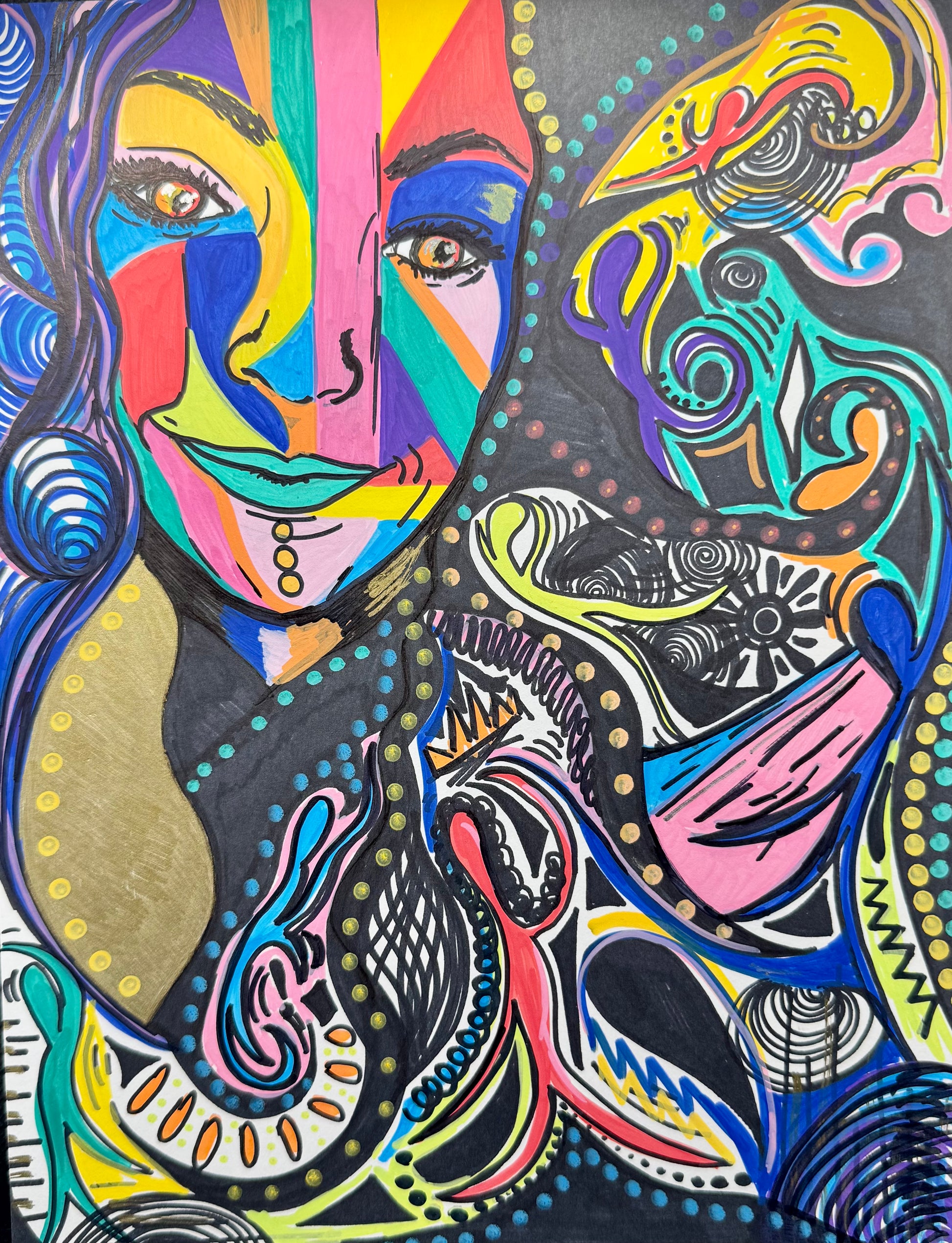 Unmasked is a 9x12 inch original work created with vibrant acrylic markers on paper, bursting with color, movement, and layered symbolism. A half-revealed face emerges from a whirlwind of pattern and palette—its eyes grounded, its smile enigmatic.