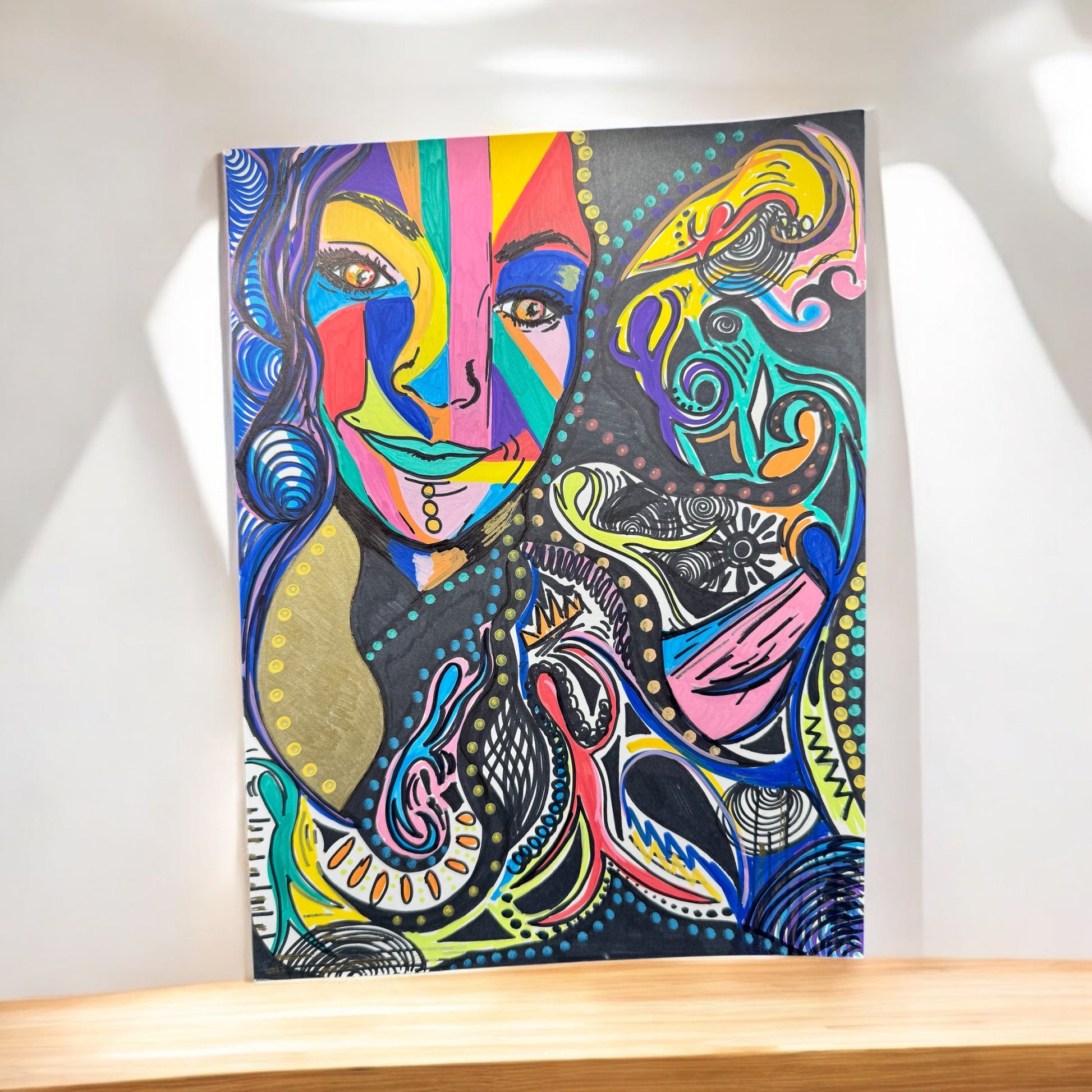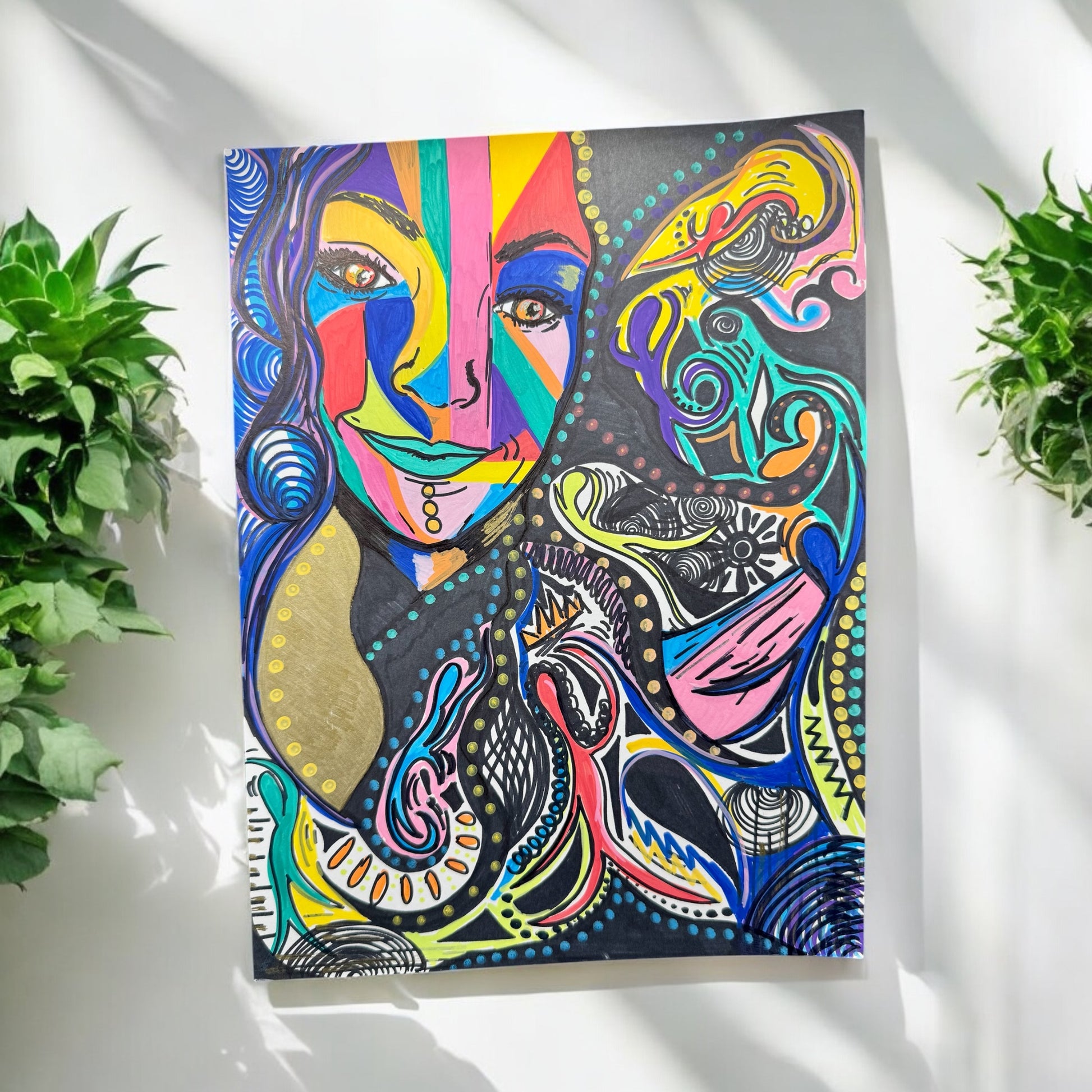 This piece radiates energy, fragmentation, and flow. The face is divided by color-blocked lines, while abstract shapes, swirling textures, and vibrant dots create a kaleidoscopic composition. Beneath the surface, Unmasked speaks to identity, multiplicity, and the beauty found in breaking away from linear form and fixed labels.