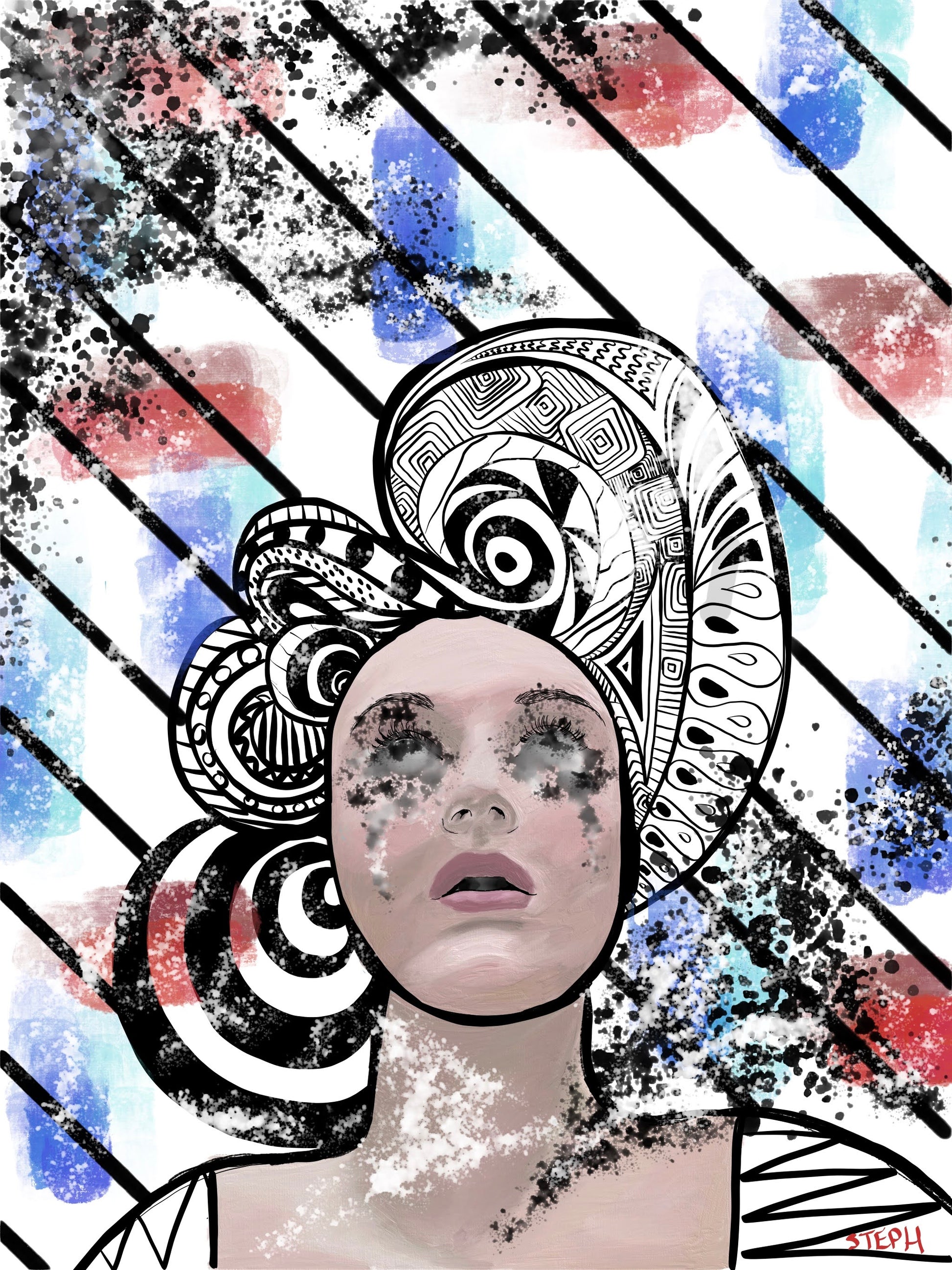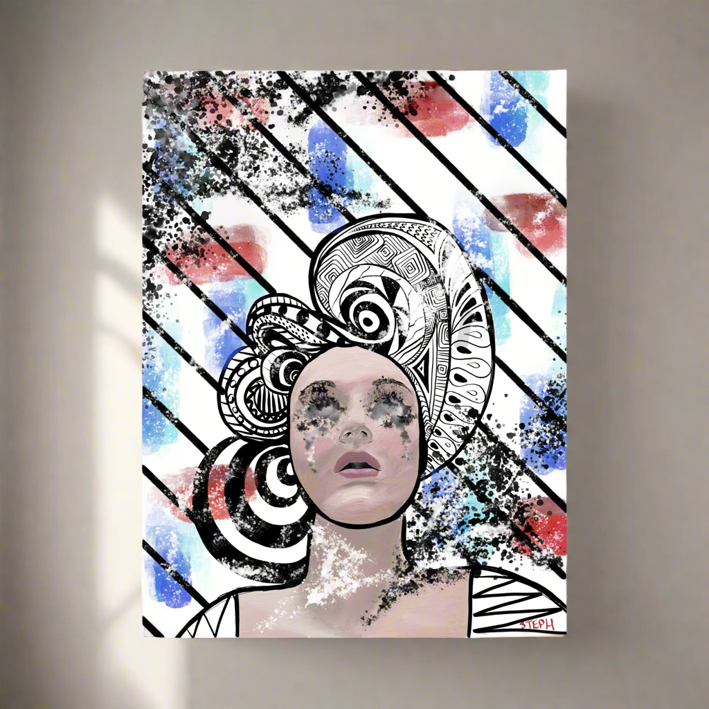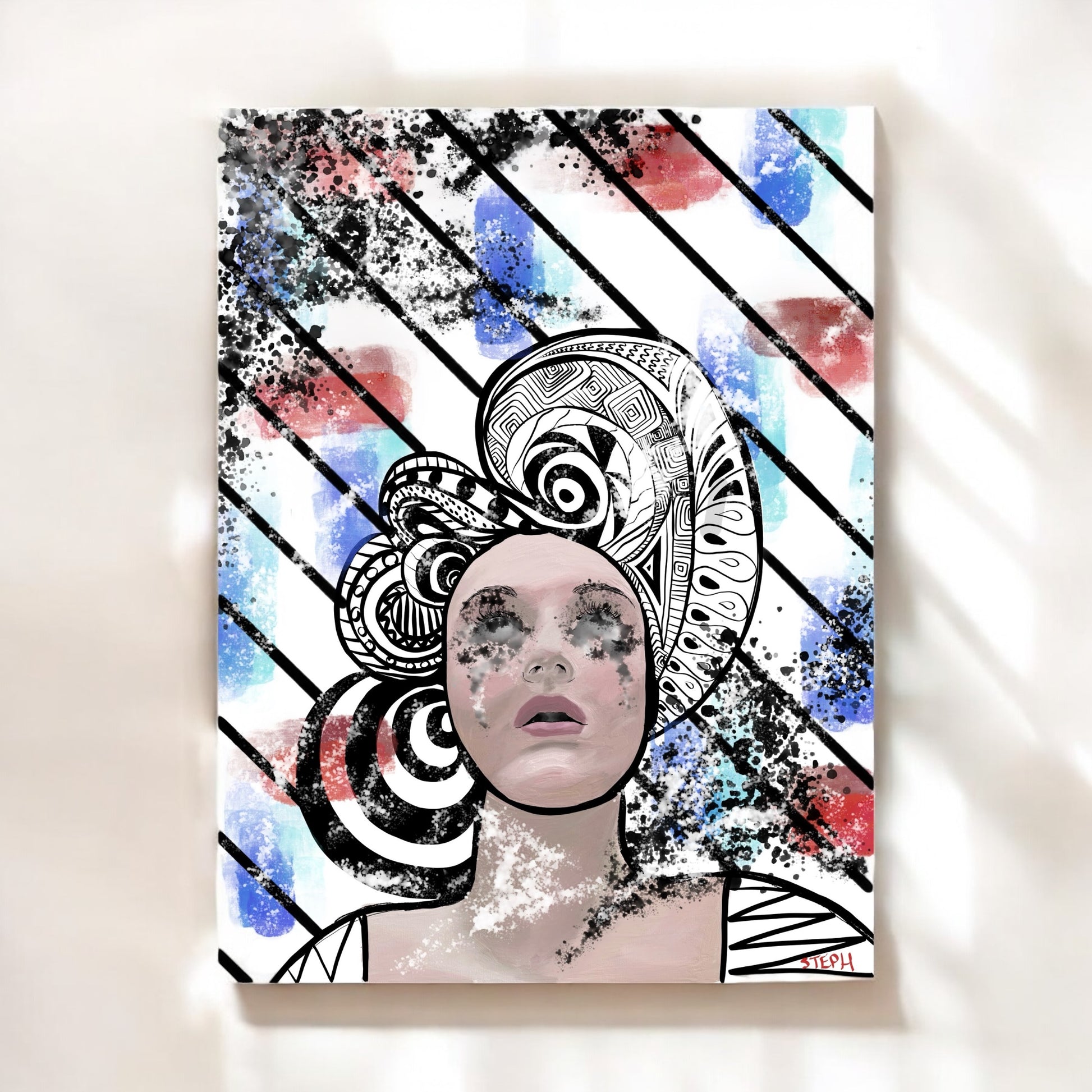 Visión Fragmentada is a striking mixed media digital print exploring the contrast between clarity and distortion. Featuring a woman gazing skyward, her face partially obscured by cosmic splatters and cultural patterns, this piece blends hand-drawn motifs with contemporary textures. It invites viewers to reflect on identity, memory, and transformation. Signed by the artist. Ideal for collectors of Afro-Caribbean or abstract expressionist art.