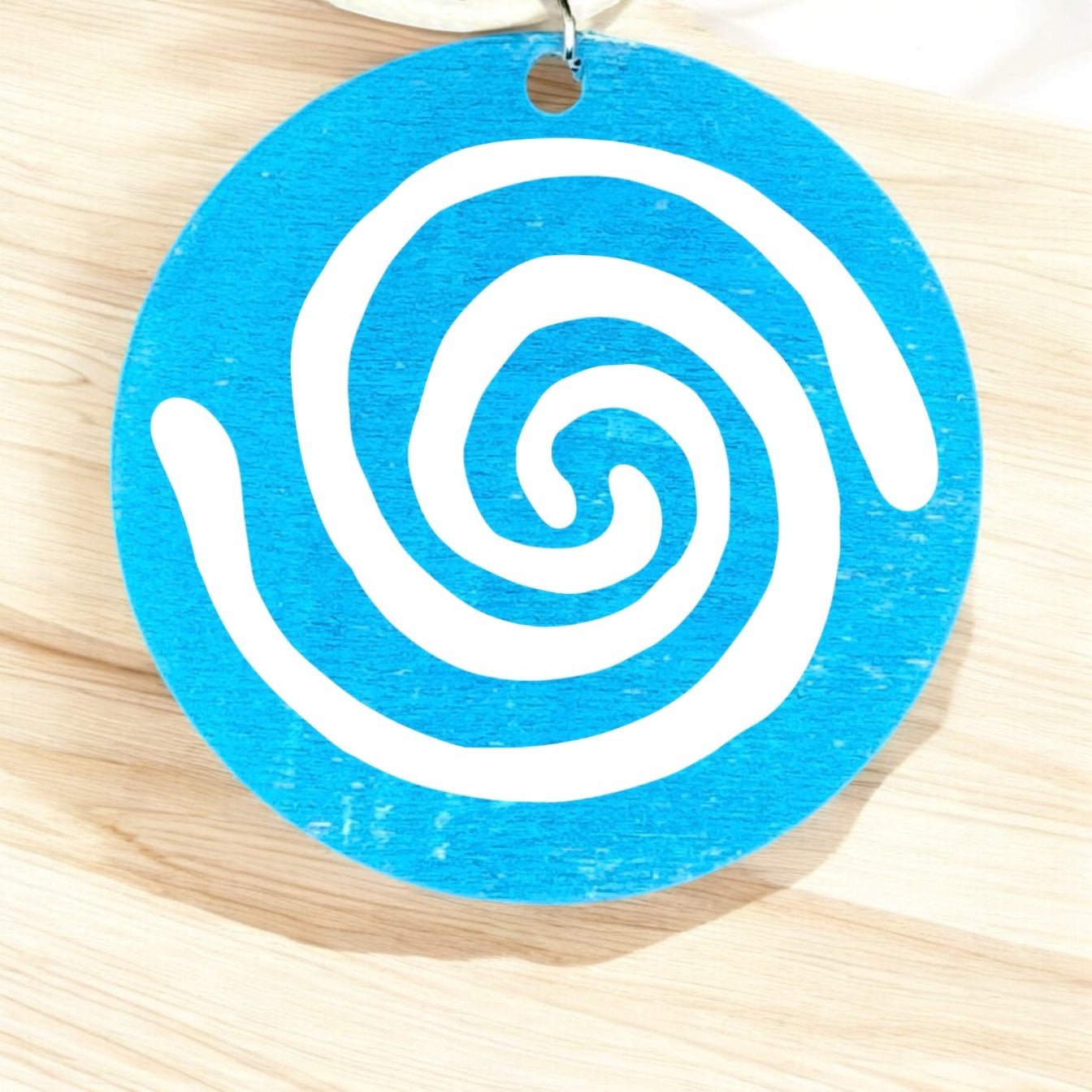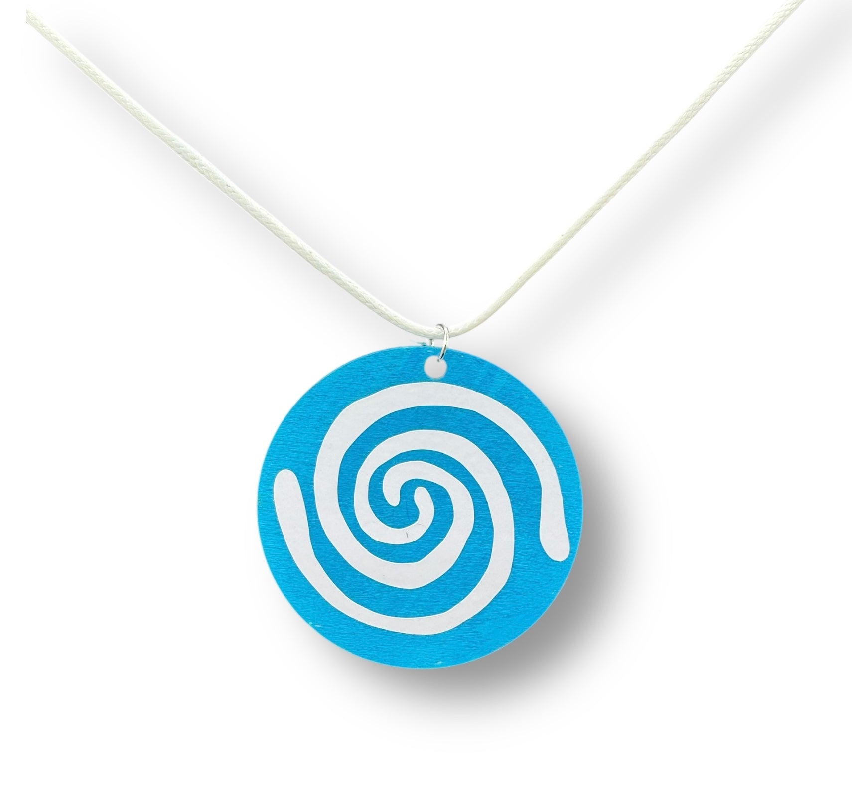 Hand-painted 2 inch wooden circular pendant featuring the Taino petroglyph for water. The Taino people believed water was the fundamental source of cosmic energy. It also represented fertility and balance. The pendant is available in several colors and made to order. The pendant hangs from a 20 inch wax sealed necklace cord.