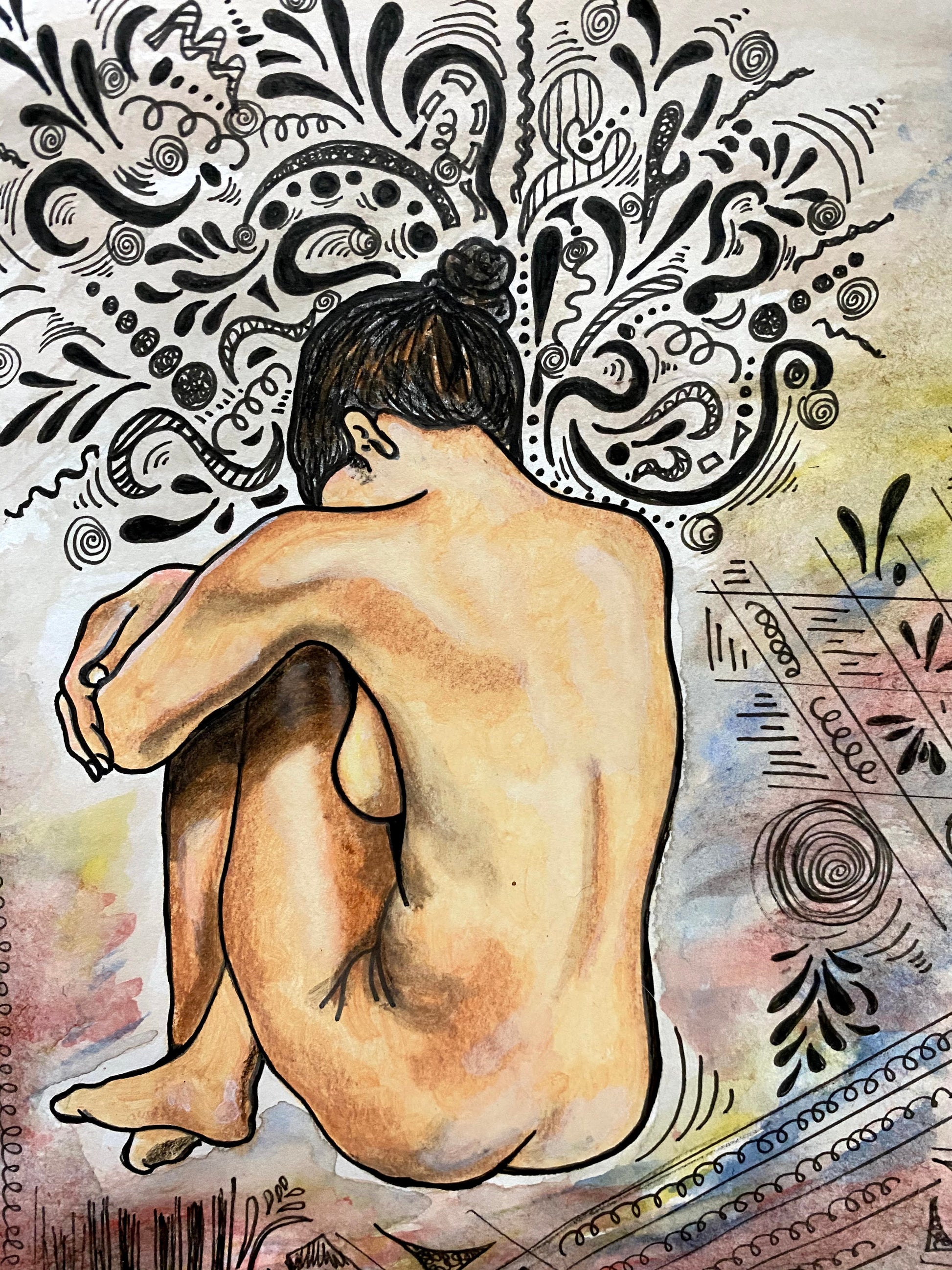 Weight of Thought captures the quiet intensity of introspection. A solitary nude figure sits curled inward as intricate, symbolic patterns spill from her mind into the world around her. This mixed-media piece by S. Tirado explores the unseen complexity of our inner lives, where beauty and burden coexist. Offered as a fine art print—perfect for spaces of meditation, empowerment, or healing.