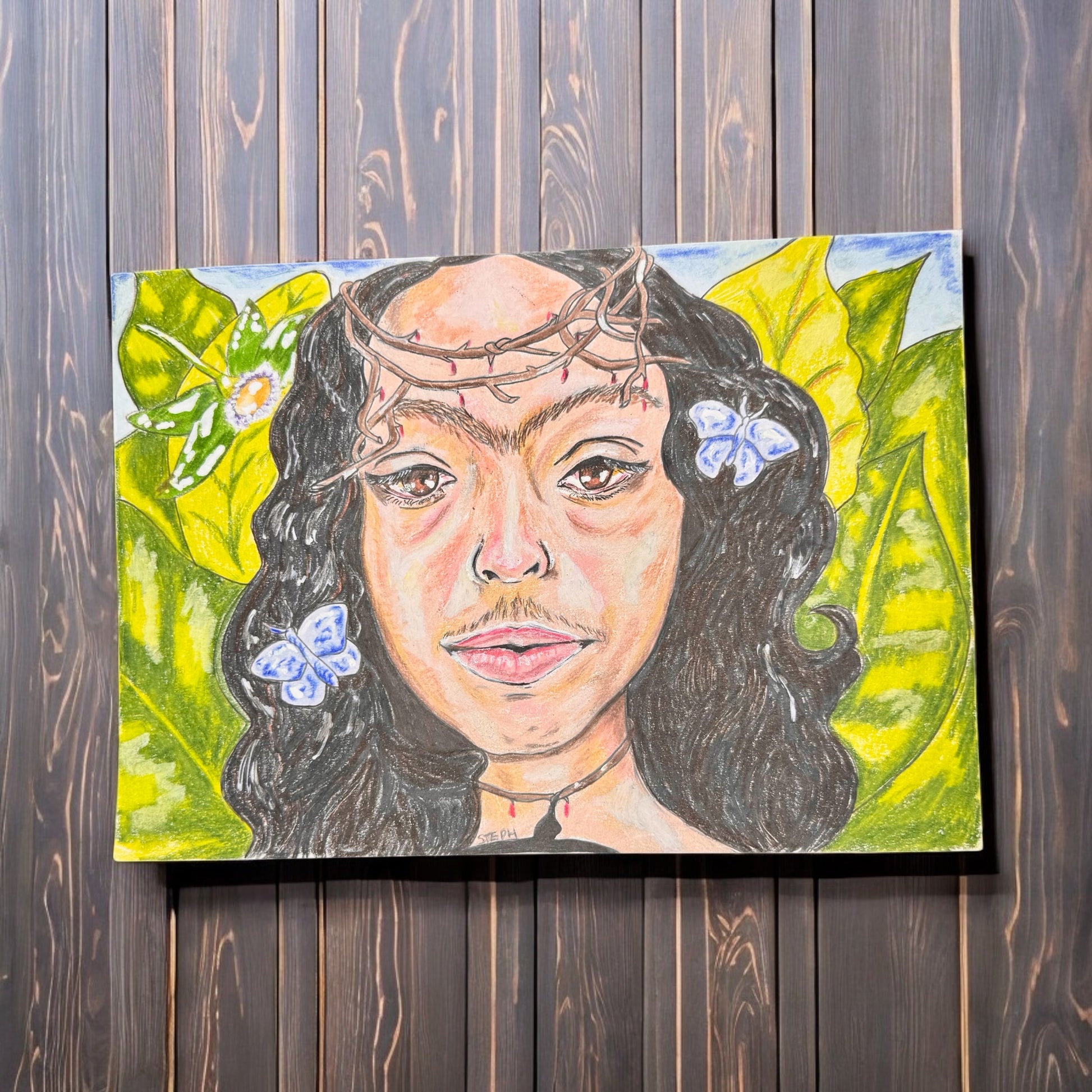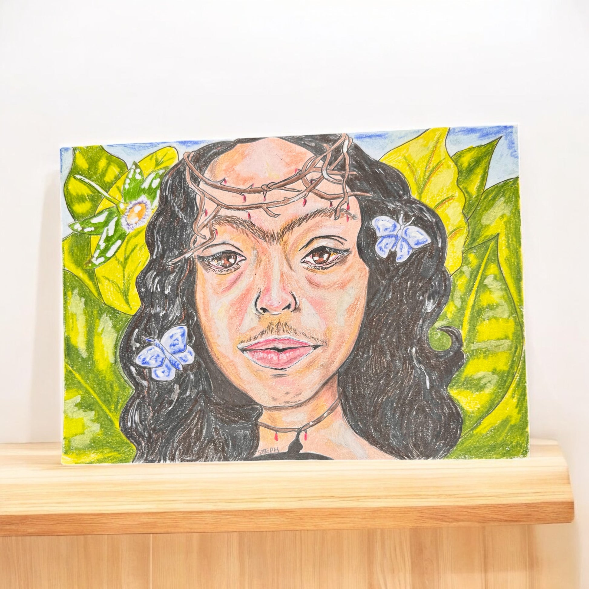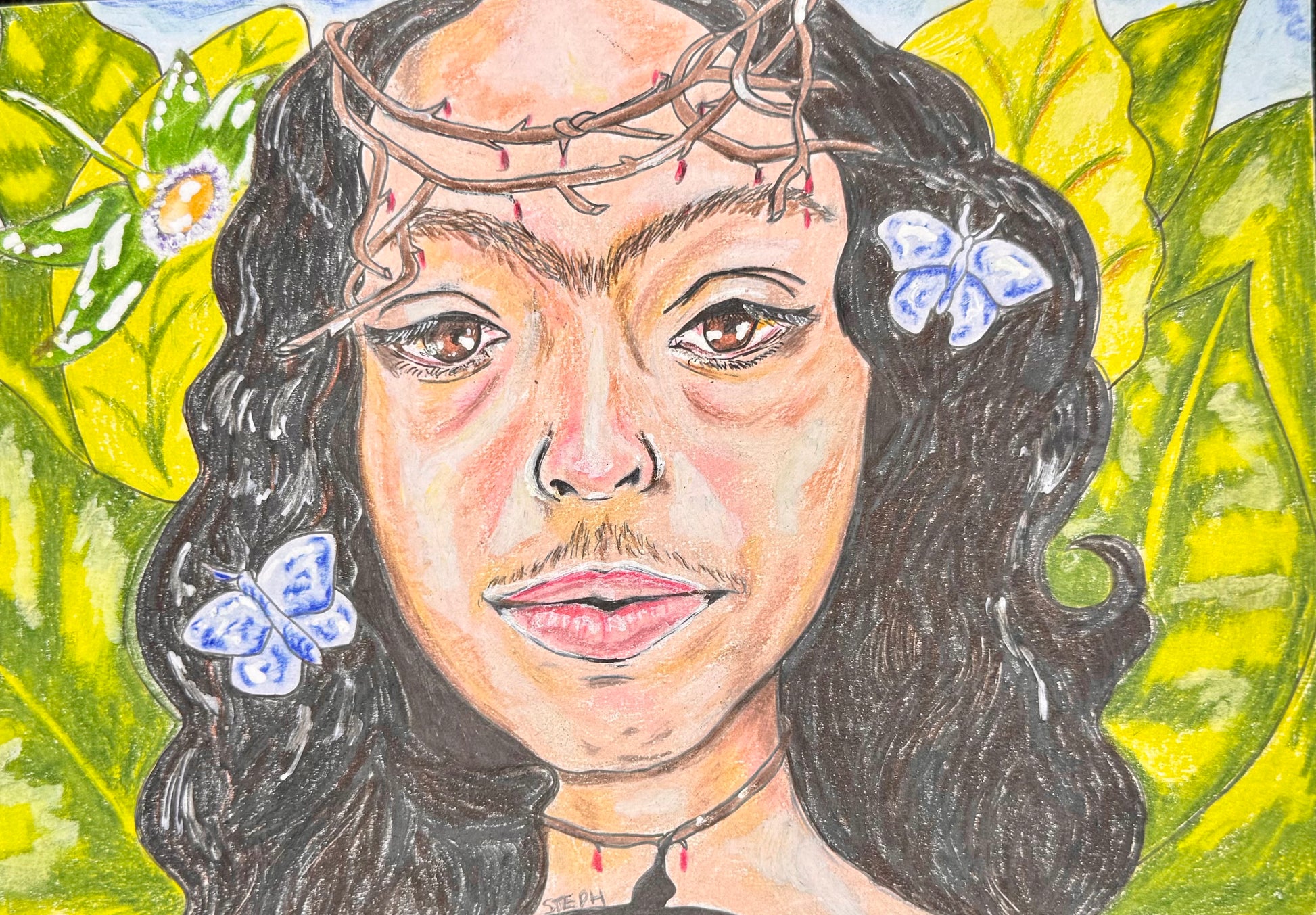 In this piece, the artist centers herself in a lush, tropical landscape—crowned by thorns and surrounded by vibrant life. Blood-red tips hint at pain endured, while blue butterflies and a blooming passionflower suggest hope, transformation, and spiritual rebirth.